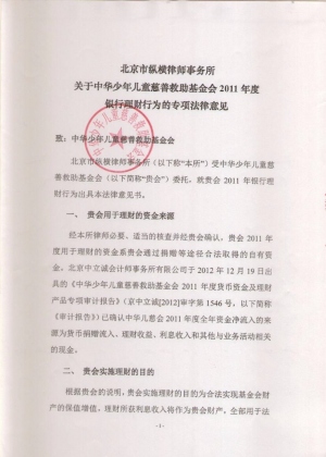 中华儿慈会2011年度银行理财行为的专项法律意见2012-12-20北京市纵横律师事务所关于中华少年儿童慈善救助基金会2011年度银行理财行为的专项法律意见 -