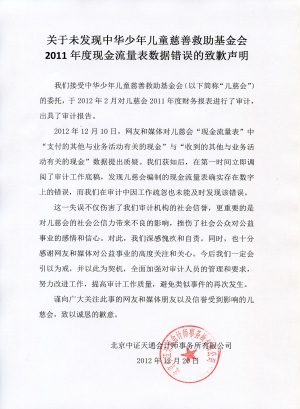 北京中证天通会计师事务所关于未发现中华儿慈会2011年度现金流量表数据错误的致歉声明2012-12-20北京中证天通会计师事务所关于未发现中华少年儿童慈善救助基金会2011年度现金流量表数据错误的致歉声明 -
