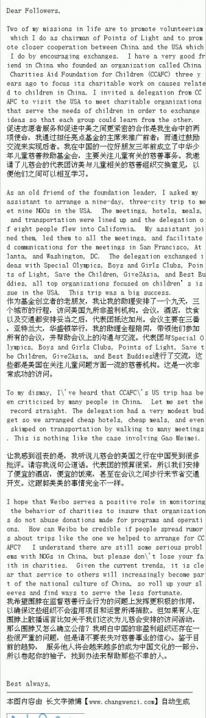 美国亮点基金会主席尼尔?布什关于中华儿慈会到美国学习考察周活动声明2012-11-192012年11月17日,亮点基金会主席尼尔•布什在其官方微博上对儿慈会到美国学习考察周活动发表了声明。