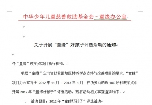 中华儿慈会“善行凉山 温暖童心”系列报道二:“童缘好孩子”奖学金评选2012-10-24中华儿慈会童缘项目计划向凉山地区20个教学点发放“童缘好孩子”奖学金。 -