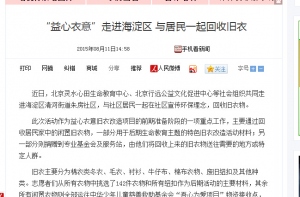 “益心衣意”走进海淀区 与居民一起回收旧衣2015-08-13近日,北京灵水心田生命教育中心、北京行远公益文化促进中心等社会组织共同走进海淀区清河街道朱房社区,与社区居民一起在社区宣传环保理念,回收旧衣物。 此次活动作为益心衣意旧衣改造项目的前期准备阶段的一项重点工作,主要通过回收居民家中的闲置旧衣物,一部分用于后期生命教育主题的特色旧衣改造活动材料;另一部分则捐赠到专业基金会及服务站,由他们将回收上来的旧衣物送往需要的地方或特定人群。 旧衣主要分为棉衣类冬衣、毛衣、衬衫、牛仔布、棉布衣物、废旧纽扣及其他种类。志愿者们从所有衣物中挑选了142件衣物和所有纽扣作为后期活动的主要材料,其余所有闲置衣物则全部运往中华少年儿童慈善救助基金会“吾心为爱项目”物资接收点,并获得了捐赠证明。 据悉,“益心衣意”旧衣改造公益行项目,是由北京团市委、北京青少年社团发展促进中心支持的常态化公益型项目,以期进一步实现“人人愿为、时时可为、处处能为”的公益新风尚。 来源:人民网 原文地址:http://ccn.people.com.cn/n/2015/0811/c366510-27444731.html
