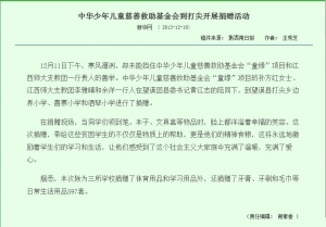 中华少年儿童慈善救助基金会到打尖开展捐赠活动2013-12-1712月11日下午,寒风凛冽,却未能挡住中华少年儿童慈善救助基金会“童缘”项目和江西师大支教团一行贵人的善举。中华少年儿童慈善救助基金会“童缘”项目的孙方红女士、江西师大支教团李雅晴和余洋一行人在望谟团县委书记黄江志的陪同下,到望谟县打尖乡边界小学、喜寨小学和洒琴小学进行了捐赠。 在捐赠现场,当同学们领到笔、本子、文具盒等物品时,脸上都洋溢着幸福的笑容。这次捐赠,带给这些贫困学生的不仅仅是物质上的帮助,更是他们的精神食粮,这将永远地激励着学生们的学习和生活,让他们感受到了这个社会主义大家庭中充满了温暖,充满了爱心。 据悉,本次除为三所学校捐赠了体育用品和学习用品外,还捐赠了牙膏、牙刷和毛巾等日常生活用品597套。 来源:新华网 原文地址:http://www.gz.xinhuanet.com/2013-12/16/c_118572188.htm