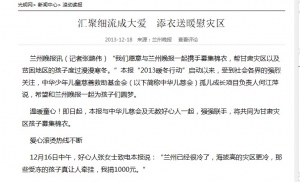 汇聚细流成大爱 添衣送暖慰灾区2013-12-18“我们愿意与兰州晚报一起携手募集棉衣,帮甘肃灾区以及贫困地区的孩子度过漫漫寒冬。”本报“2013暖冬行动”启动以来,受到社会各界的强烈关注,中华少年儿童慈善救助基金会(以下简称中华儿慈会)孤儿成长项目负责人何江萍说,希望和兰州晚报一起为孩子们圆梦。 温暖童心!即日起,本报与中华儿慈会及无数好心人一起,强强联手,将共同为甘肃灾区孩子募集棉衣。 爱心滚烫热线不断 12月16日中午,好心人张女士致电本报说:“兰州已经很冷了,海拔高的灾区更冷,那些受冻的孩子真让人牵挂,我捐1000元。” 昨日一大早,家住新港城的钱女士就打电话咨询捐赠地址:“我已经把两大包毛衣装在车上了,正准备从新港城出发,不知你们单位的具体地址在哪儿?” 昨日下午,记者又接到一名国有企业员工打来电话:我想捐1000元,但不知道你们如何做到公开透明,让捐助者放心?当得知本报会及时公布捐助、购买和捐赠信息后,这位好心人要去了爱心账号,表示将尽快捐赠。 与此同时,“暖冬行动”天水地区传来喜讯:一位上海好心人表示看到晚报报道后,被灾区孩子的境况所震撼,希望晚报选一所学校,她愿长期资助,今年会向活动捐助2万元。 仅仅两天时间,记者就接到了十余个爱心电话,其中大部分人士当场索要爱心卡号表示要捐助现金,或者捐助物资。 给灾区孩子添衣送暖 “我们还想为灾区的孩子做点实事!”7·22定西地震后,中华儿慈会将7名重灾区孤儿带至北京休养,随后又帮他们在北京上学。连日来,本报连续刊发多篇灾区孤儿在北京上学的有关情况,与中华儿慈会建立了良好关系。 本报长期以来坚持传递大爱、扶弱济困的公益理念深受中华儿慈会的肯定,在本报筹备“暖冬行动”期间,中华儿慈会孤儿成长项目负责人何江萍即表示愿意与本报携手募捐爱心棉衣,共同帮灾区孩子度过漫漫寒冬。 即日起,中华儿慈会将在全国范围内征集爱心物资,社会各界捐助的爱心款捐入中华儿慈会账户。本报将和中华儿慈会一起在网站和报纸上及时刊登募捐信息,做到公益捐助公开透明。 由于进入深冬,甘肃地区天气已十分寒冷,“暖冬行动”募捐阶段将于月底结束,届时,本报将与中华儿慈会等单位在灾区举行捐赠仪式,之后共同分发物资。 特别提醒 3元一双毛袜,5元一双手套,10元一条围巾,80元一件冬衣……“暖冬行动”期待您的加入,帮助那些还在视“温暖”为奢望的孩子们度过漫漫寒冬。 您可捐助实物,也可以捐助现金。所捐财物将实行严格监管,并将在第一时间送到贫困孩子的手中。欢迎爱心人士监督。 注:捐现金者请在汇款时注明“孤儿成长救助‘暖冬行动’”。捐赠热线:0931-4286666 18193105869 捐赠地址:兰州市城关区雁南路299号兰州报业大厦11楼 爱心账号:320756027856开户银行:中国银行北京分行西翠路支行户名:中华少年儿童慈善救助基金会 来源:光明网 原文地址:http://news.gmw.cn/newspaper/2013-12/18/content_2609722.htm