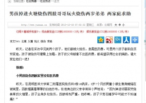 男孩掉进火塘烧伤四肢哥哥玩火烧伤两岁弟弟 两家庭求助2013-12-19昨天,记者在采访中见到两个孩子,他们都被火烧伤,急需医药费??墒橇礁龊⒆佣祭醋云肚罴彝ィ⒆颖簧丈丝晌窖┥霞铀?。孩子的父母都拿不出医药费,都希望获得社会的捐助,请大家拉他们一把! 惨剧1 小男孩烧伤四肢家里没有医药费 昨天,在昆明医科大学第二附属医院烧伤科3楼16病床,3岁7个月的男童小顺生侧身蜷缩在被窝里,四肢缠裹着厚厚的白色纱布,在他身边的父亲李常祥小声地说:“因为掉进邻居家焚烧粪草的火塘里,孩子全身多处烧伤,四肢特别严重。他疼啊,孩子只有在睡梦中可能才不知道痛!” 小顺生来自普洱市镇沅县农村,家里有70岁的奶奶,48岁的父亲,28岁的母亲和5岁半的姐姐。他们全家仅靠种植烤烟和养点鸡鸭来养家糊口,母亲还患有精神病。小顺生出生后不到一个月,母亲精神病突然发作被送进了医院,从那时起,渴望母乳的小顺生仅靠父亲买来的便宜奶粉喂养。 今年12月14日傍晚,父母在外做农活,奶奶在家煮饭,小顺生在门外独自玩耍。邻居家门外有个小塘子,点燃的粪草窜起火焰。小顺生走着走着,掉进了火塘,燃烧的粪草烧得他哭叫着。他奶奶听到叫声后,冲出去把孙子从火堆里抱了出来。 孩子头部、腹部轻微烧伤,但双手、双脚伤得特别严重。赶回家的李常祥骑着三轮摩托车将孩子送到了当地卫生院。由于忘带家中仅存有3000元钱的一本存折,李常祥拿着卫生院一名医生借的1500元连夜把孩子送到镇沅县医院治疗,之后又于16日凌晨转到昆明医科大学第二附属医院烧伤科治疗。 小顺生住进医院后,医药费难住了父亲。他的二叔从镇沅赶来,为侄儿交了几千元费用后昨日又返回老家筹钱借钱去了。他在电话里告诉记者,他回家到底能筹借多少钱,心里一点谱也没有。 昨日,晚报记者看到,输着液的小顺生沉睡着了。李常祥说:“家里除了存有3000元钱的一本存折外,没有其他的钱了。听医生说,孩子一只手的手指和一只脚的脚趾恐怕保不住了,要医治孩子大概需要5万多元钱。我们家就是砸锅卖铁也筹不出这么多钱啊!我希望好心人伸伸手帮帮孩子!” 惨剧2 哥哥玩火烧伤弟弟重担落在母亲身上 不幸的家庭还有马付艳一家,她两岁大的小云刚在哥哥玩火时被烧伤。母亲马付艳带儿子辗转到北京医治,一样为医药费犯难。 今年26岁的马付艳是昭通镇雄县场坝镇安家坝村人,有3个儿子,小儿子只有两岁多,老母亲已70高龄。去年4月,丈夫因故意伤害罪被判有期徒刑4年进了监狱,照顾孩子和母亲的担子全落在马付艳身上。她一个人打着零工和种着田地,种地年收入2000元左右,平时就靠着打零工挣钱贴补家用。 今年11月13日晚上,家里停电,马付艳到外面买水,大儿子在家里玩起了火机和蜡烛,没想到将床铺点燃,小云刚被火烧得大声哭喊。当孩子的奶奶返回家中时,小云刚已被烧得面目全非。 经检查,孩子全身烧伤面积50%(三度烧伤)。住院10多天,用去医疗费3万多元,其中借款2万,好心人的捐款1万余元。 通过好心人帮助,马付艳联系上了中华少年儿童慈善救助基金会9958儿童紧急救助中心,并将孩子送到北京空军总医院治疗。经医生检查,发现孩子多处为深二度至四度烧伤;双手指及右足趾干性坏死,并伴有脓毒症。 据中华少年儿童慈善救助基金会志愿者介绍,目前治疗小云刚的前期费用至少10万元。对此,为了孩子能顺利手术,9958儿童紧急救助中心及时拨款3万用于小云刚的手术治疗。这名志愿者说,小云刚家十分贫穷,住的是老辈留下的石墙茅草房。孩子的父亲因犯罪被判刑,妈妈在家打零工和种庄稼为生,带着3个幼小的孩子,还要照顾70多岁的婆母。“哪怕小云刚没有出意外,一家子的生活都是问题。那天9958儿童紧急救助中心工作人员将视频传给她时,一打开视频就传来小云刚一阵阵凄厉的疼叫,当时心就碎了。希望社会各界爱心人士伸出援手帮助这个幼小的生命渡过难关。” 昨日,记者电话联系了小云刚的母亲马付艳。马付艳在电话中说:“明天,儿子就要做手术了,我真担心。家中一是没钱,手术后孩子的治疗费不无着落,我真不知道该怎么办……” 请大家帮帮马付艳和小云刚吧!马付艳的联系电话是:13278675879。 来源:春城晚报 原文地址:http://society.yunnan.cn/html/2013-12/18/content_3001419.htm