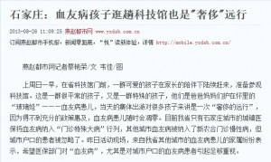石家庄:血友病孩子逛趟科技馆也是"奢侈"远行2013-08-27上周日一早,在省科技馆门前,一群可爱的孩子在家长的陪伴下陆续赶来,准备参观科技馆。这是一群很平常的孩子,又是一群特殊的孩子,他们是爸爸妈妈们护在怀里的“玻璃娃”———血友病患儿,当天的集体出游对很多孩子来讲是一次“奢侈的远行”,因为得不到充分的政策惠及,血友病患儿随时会凋零。目前我省只有石家庄城市的城镇医保将血友病纳入“门诊特殊大病”行列,其他城市血友病被纳入了新农合门诊慢性病,但城市户口的患者被忽略了。昨日活动现场,来自我省其他城市的血友病患儿的家属纷纷表示,希望医保部门对“血友病”,尤其是对城市户口的血友病患者引起足够重视。 八岁男孩没去过游乐场 当天10时许,来自保定、沧州等不同城市的孩子们陆陆续续赶来排好了队。这次集体出游主要是参观省科技馆和省博物馆,也是血友病患儿的一次社会融合活动。是中国血友病之家、河北省血友病联谊会以及壹基金联合组织的。 现场记者看到,参加活动的大孩子有十二三岁,年龄小点的小朋友有的两三岁,最小的只有一周八个月。每名孩子都是至少两名家长陪同。“我们只能轮着抱着他,他太小,不知轻重,磕碰了就麻烦了。”来自保定的童童被妈妈抱在怀里,童童妈妈告诉记者,孩子两周八个月了,不敢让他随意走。 省会的李先生看着开心得要蹦高的儿子晨晨告诉记者,孩子今年8岁了,可是家人从来没有带他去过儿童游乐场,怕人多碰着他,更担心小火车、碰碰车、蹦蹦床这些“要命”玩具磕了孩子,引来出血的大麻烦。 排好队,慢慢入场。孩子们先参观了宇宙剧场,当坐在巨大的穹幕下,看到了“夏季夜空”中闪亮的牛郎星、织女星,孩子们都屏住了呼吸。 唰!随着闪亮的天鹰座、天琴座、天鹅座、人马座、天蝎座先后在黑暗的夜空中闪入孩子们的眼帘,宇宙剧场内想起了孩子们兴奋的欢呼。“星空,太漂亮了。”“哇塞!宇宙剧场酷毙了。”晨晨和爸爸说,科技馆这么好玩儿,真是早就该带他来看。“这些孩子大部分都是第一次来科技馆。”河北省血友联谊会相关负责人王女士告诉记者,她们这个联谊会是一个自发性的、抱团取暖的组织,大家都是因为家有患血友病的孩子而联系到了一起。参观科技馆、博物馆,对一般的孩子来说是很正常的户外活动,但是血友病孩子们因为“伤不起‘很少出门。 现象 我省约有3500—7000名血友病患者 血友病是一种典型的伴性遗传性凝血功能障碍疾病,患者因体内缺少凝血因子,导致无法正常凝血。血友病新生儿发病率为万分之零点五到万分之一,属于典型的罕见病。我国约有7万—15万名血友病患者,按发病学原理我省约有3500—7000名血友病患者,但在册登记的不足300人。 血友病英文原意是“嗜血之病”,患者多自幼发病、自发或轻度外伤后因凝血功能障碍,出血不能自发停止;关节和肌肉常见频繁出血,如得不到及时有效治疗关节多变形致残。血友病患者颅内或腹腔、内脏等出血常危及生命。 从遗传角度讲,一般由女性遗传给子女。女性携带基因,下一代男性往往会成为血友病患者,而下一代女性则可能携带致病基因,再遗传给子女。“家长对这个病如果没有足够的认知,会非常惊慌失措,甚至不敢面对。”帅气的小伙子刘政是北京血友之家关爱中心的项目主管,也是昨日活动的爱心融合志愿者,他这样告诉记者。在农村,血友病患儿被很多人认为是“糟钱的无底洞”、“没面子的孩子”。 现状 有钱有药可以很好,没钱没药情况糟糕 “血友病同其他疾病所不同的是与生俱来,伴随终生,很麻烦。但患者只要有凝血因子补充即可像常人一样生活。”来自我省一家医院的权威专家介绍,他会经常这样客观地劝慰血友病患儿的家长。 目前,我国很多地区十八岁以下儿童已经开始接受先进治疗理念进行预防治疗,他们不会出现频繁出血,关节变形很少,他们可以从事日常较轻的劳动,能够和正常孩子一样接受教育,他们长大成人后关节几乎不会变形,能融入正常的生活。 专家的话在承德来的李艾先生的身上得到了印证。李艾今年35岁,在省会经营电子行业,“我的关节是变形的,我走路的姿势你能看出来。”李艾不避讳自己的病情,他告诉记者,他1岁半时被发现得了血友病,那个年代,只有靠输血浆来获得宝贵的凝血因子,身体落下的后遗症影响了他日后的就业和择偶。“凝血因子大概是到了1998年时,市场上才有售。”李艾说相对于他们那一代,现在的血友病患儿从用药角度讲是幸运的,起码能买到有效的药品。 记者了解到,现在出售的药品“凝血因子”分国产和进口两种,价位目前是国产的一支需要396元,进口的一支是1122元。“凝血因子”是血友病患儿家冰箱里随时冷藏的救命药。 “今年以来,我们童童用了20支了,因为不能报销,全是自费。”童童的妈妈刘女士告诉记者,为了照顾孩子,她是全职妈妈,丈夫一个月3000元的收入不够给童童买药用。“现状只能靠老人的退休金。”说话间,刘女士的眼圈红了。 贾女士说今年春天,18岁的儿子髋关节自发性出血反复发生了4次,从元月到现在他给孩子用药400支。“今年总共投入了20多万元。”贾女士坦言她和爱人事业都不错,收入上还可以对付孩子的用药,因为石家庄市民的居民医保里血友病是门诊特种大病之一,她每隔3个月可以报销