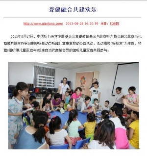聋健融合共建欢乐2013-08-292013年8月17日,中国听力医学发展基金会复聪教育基金与北京听力协会联合北京当代商城共同主办第49期咿呀总动员听障儿童康复救助公益活动?;疃?quot;好朋友"为主题,特邀8组听障儿童家庭与9组来自当代商城会员的健听儿童家庭共同参与。 此次活动通过咿呀总动员绘本舞台剧、亲子互动游戏和素质课等形式,消除了听障孩子与健听孩子的沟通障碍,创造轻松愉快的融合式交流环境,既有助于听障孩子的康复,使他们的社会性和个性得到全面、健康的发展,又激发了健听孩子从小对善良、友爱的公益之心。活动尾声,当代商城的会员及其员工纷纷奉献爱心,为听障孩子们捐赠了专业听力语言康复书籍。希望未来有更多社会爱心人士及孩子参与咿呀总动员听障儿童康复救助公益活动,欢乐互动,聋健融合,共建健康和谐社会。 目前,中国有1.2亿人存在听力障碍,其中听力语言残疾人达2780万,仅7岁以下的听障儿童就有80多万,每年还有约3万新生听障儿童。0-7岁是儿童语言发展的关键期,越早接受干预措施则康复效果就越好,这些听障儿童如果在7岁前得到及时有效干预,其康复率可以超过90%。 咿呀总动员是一项以“亲子.游戏.社交”为主旨的集体互动游戏活动,是由北京听力协会、复聪教育基金及聋康网共同发起,中华少年儿童慈善救助基金会与社会工作委员会专项资金联合支持,面向听障儿童家庭的公益项目。如果你喜欢孩子,有爱心,热爱参与公益活动,可以通过yiyargroup@gmail.com报名加入到北京听力协会咿呀总动员的志愿者队伍中。 来源:TOM网 原文地址:http://life.qianlong.com/36311/2013/08/28/4302%408909310.htm