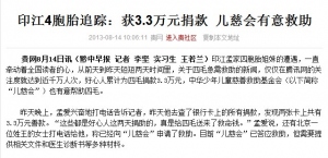 印江4胞胎追踪:获3.3万元捐款 儿慈会有意救助2013-08-14贵网8月14日讯(黔中早报 记者 李坚 实习生 王若兰)印江孟家四胞胎姐妹的遭遇,一直牵动着全国读者的心,从前天到昨天短短两天时间里,关于四毛急需救助的新闻,仅仅在腾讯网的关注度就达到近千万人次,好心人累计为四毛捐款3.3万元,中华少年儿童慈善救助基金会(以下简称“儿慈会”)也有意帮助四毛。 昨天晚上,孟爱兴奋地打电话告诉记者,昨天他去查了银行卡上的所有捐款,发现两张卡上共有3.3万元善款。“这些都是好心人这两天捐助的,真是给四毛送来了救命钱。”孟爱说,还有北京一位姓王的女士打电话给他,称已经向“儿慈会”申请了救助。目前“儿慈会”已答应救助,但需要提供相关文件和医生诊断书等多种材料。 “目前需要四毛的具体病情资料,以及治疗费预算情况。”记者联系上王女士。王女士称,她曾经多次帮助过像四毛这样的早产儿,现在她想帮助四毛,只要孟爱和医院能够提交“儿慈会”需要的各种材料,她会尽力争取资金救助。现在“儿慈会”有关负责人也了解了四毛的情况,正在等待家属提供详细资料。 记者了解到,自从腾讯网转载了早报的报道后,两天时间里有近千万网友关注四姐妹的遭遇,其中有1.8万读者参与话题讨论,2500多名热心网友留言祝福,其中有500名左右的好心人捐助帮助她们一家。 目前,早报记者正协同孟爱准备相关资料,争取专业基金会的救助。 来源:黔中早报 原文地址:http://news.qbnews.cn/2013/0814/107020.html