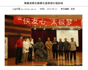 特教老师太极拳公益培训计划启动2013-08-14近日,“侠友心·太极梦——全国贫困地区中小学及特教老师太极拳师资公益培训计划”启动仪式在北京举行。接下来,来自全国各地的35名特教老师、边远乡村教师,将在12天里,圆自己的太极梦,并且成为传递太极的使者。 本次活动主办方“侠友新社”的创始人万周迎说,该计划是由北京侠友新社主办,得到了中华少年儿童慈善救助基金会、中国青少年发展基金会、中国盲人协会、北京市武术运动协会、北京武术院、尊尼获加威士忌俱乐部等的大力支持。培训真正全部免费,包括来往北京的交通、食宿费用,此计划将进行三年。万周迎说,我们一直希望以自己的方式,帮助那些身处困境,但不放弃希望的贫困乡村老师,和特教老师。教山村、盲人、聋哑学校的老师学会真功夫太极,可以造福全国的弱势儿童,是传播中国文化、传播大爱的好方式。此次培训是侠友在三年基础工作上开展的,充分体现了专业性、精品性、和唯一性。培训同时包含健全老师和盲人老师一起学习,搭建一个残健共同学习、共融的平台。 启动活动中,草根盲人太极“梦想之队”的演出《黑暗中的太极 ·云水禅心》,引起了极大关注。这次演出经过多重设计,除了太极的行云流水,还有队员表演敦煌飞天,中国传统文化的韵味非常浓厚,真实地体现了太极的真谛:平和、包容、智慧、和爱!这支民间队伍由盲人按摩师组成,他们利用业余时间,不畏艰难,废寝忘食地排练节目。有的盲女来练习一次,单程要三个多小时。尽管很困难,他们依然非常乐观,他们和健全人一样在追求美好的生活。 这次培训学员来自五湖四海,每个人都有一段非常感人的故事经历,太极拳阴阳平衡、枢机动静、以柔克刚的特点和深厚的文化底蕴,不仅可以帮助他们强身健体、养生保健,更可以传达给他们一种健康快乐的为人处世方式,静对、从容面对人生坎坷的态度与方法。这12天的学习中,老师们将亲眼见证“盲侠教拳”、“盲侠”带领健全人背诵《道德经》等,国内唯一的奇迹。除了学拳,还有与中医、古琴等传统文化领域的知名专家学者,进行面对面的学习交流的机会。他们学成归去之后,将造福全国的弱势儿童。 演出节目《道德经》唱诵也非常震撼,两位全盲青少年,洋洋洒洒,以古典韵律背诵5000字《道德经》。台上三分钟,台下十年功,他们付出了常人无法比拟的努力。念念不忘,必有回响,专心做一件事,一定能成功。 万周迎笑言,活动之初,曾面对过无数的怀疑和讽刺,但坚持不懈换来的是现在的应接不暇;是广大学员接受了我们的公益心,也是他们帮我们一起圆了自己的侠友梦,可以不畏艰难,永远向前!活动不在于有没有大腕儿,而在于是否真心、侠友故事感人至深,同时又有功夫的传奇色彩。启动仪式中很多岗位的服务人员都是残疾人,他们不仅仅是接受捐助,他们已经有能力参与工作,回馈社会了。 “俠友心 ·太极梦”启动仪式上,中华少年儿童慈善救助基金会、中国青少年发展基金会新工场协力中心、中国残疾人联合会、中国盲人协会、北京市武术运动协会、北京武术院的领导,及多位企业界、文化界名人出席。最后,曾任国家图书馆党委书记、中国美术馆副馆长,现为中国书法家协会理事、鉴定评估委员会副主任的杨炳延先生为培训计划揭开了一个真人大小的太极铜像,宣布活动正式开始。 来源:新浪公益 原文地址:http://gongyi.china.com.cn/2013-08/13/content_6205417.htm