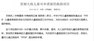 贫困大病儿童可申请新的救助项目2013-08-15本报讯(华商晨报 华商响网记者 周苗苗)昨日,中华少年儿童慈善救助基金会“9958”儿童紧急救助项目与沈阳市儿童医院签订合作协议,为东北地区0~16岁贫困大病患儿提供帮助。 这个项目是针对0~16岁重大疾病、意外伤害、虐待、无人监护贫困儿童的紧急医疗救助,受自然灾害影响的儿童救援的专项基金。与沈阳市儿童医院签订合作协议后,贫困儿童可以通过医院向“9958”提出帮助申请。 在对患儿的家庭收入情况、病情进行审核后,如果达到救助标准“9958”会对其进行定向的资金援助或者是“9958”为其开设公共募捐平台。同时,沈阳市儿童医院也会给予减免20%治疗费的帮助。目前,该项目仅在儿童医院一个医院就资助了30万元。 在沈阳其他医院就医的贫困患儿,也可以通过4000069958热线进行申请,审核通过后会得到帮助。 来源:华商晨报 原文地址:http://news.gmw.cn/newspaper/2013-08/15/content_1958019.htm