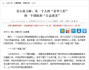 爱心接力棒:从一个人的“希望工程”2013-08-19陶巧,一个出生在云南省镇雄县坡头乡偏远山村的苗族女孩,如今已经有了工作并且结婚有了自己幸福的家庭。但是,她却有着一段不同寻常的经历:当初若不是有好心人资助,也许她早已辍学在家,不可能有走出大山上大学的机会。这一切还要从一个人的“希望工程”说起。 一个人的“希望工程” 1998年的冬天,一个下雪的清晨,一辆面包车缓缓地驶进了陶巧所在的云南昭通镇雄县坡头乡亳都小学,好奇的同学们蜂拥而上,把车子围了个水泄不通,车上下来一个人和同学们亲切的打招呼。而此时的陶巧也许不会知道,她的人生轨迹就此发生了改变。据陶巧回忆,当时她父亲发生意外突然去世,面对70多岁的奶奶和上学的孩子,她的母亲常常独自流泪。哥哥姐姐外出打工,上小学五年级的她也面临辍学。 第二天,班主任老师把陶巧、郑刚和另外两名同学叫到办公室,说省城来的一位李叔叔愿意资助他们4个上学,李叔叔每个学期都会给他们每人寄200元学费到学校。并让他们告诉家长,不用再为每个学期的学费发愁了。幸运之神的突然降临,让陶巧有点摸不着头脑,她不知道为什么,也不认识李叔叔,只是不再为学费的事情看到妈妈皱眉头了,她心里特别高兴。从此她的心里也就记住了这么一个神秘的“李叔叔”。而这位“李叔叔”也从此开始了他一个人的“希望工程”。 两年之后,陶巧考入云南民族中学,第一次来到省城昆明。 “到达昆明已经是晚上十二点了,大雨中的车站,我拨通了李叔叔的电话,一辆面包车的车窗中,一张和蔼可亲的笑脸,这就是李叔叔!这个雨夜是我们的第一次见面,他把人群中瘦小的我接回他家,他爱人张阿姨帮我洗澡,找新衣服给我换上,一家人对我很关心。那一年我13岁,第一次离开妈妈来到一个陌生的地方。”陶巧回忆着第一次与李叔叔见面的场景。 这样的资助一直伴随着陶巧度过初中、高中,直到陶巧考上了海南大学。虽然陶巧可以申请助学贷款不想再要李叔叔资助,但是李叔叔他还是坚持每年给陶巧几千元的生活费,让陶巧能和其他同学一样,有自己的电脑,能够专心读书学习。“李叔叔对我的帮助不仅是经济上的,在思想上和生活上也给我很多指导帮助。我很幸运,更确切的说是庆幸,在我们几个孩子最困难的时候遇到李叔叔,在我个人对生活快要失去信心的时候遇到李叔叔。我很感激他改变了我的家庭,改变了我的人生!”陶巧满怀感激地说。 带动身边人“捐资助学” 其实,陶巧称的“李叔叔”就是盈江地震之后,通过腾讯微博呼吁为盈江地震灾区小学校建厕所的盈江县委副书记李毅。到盈江挂职锻炼之后,李毅的“希望工程”还在继续。在盈江地震中失去了姐姐的李竟娜高位截肢,还和妈妈一起在捐款现场坚持为盈江救灾捐款200元。李毅知道情况后,积极联系中国少年儿童慈善基金会和昆明假肢厂为李竟娜免费配制了假肢,帮她去掉双拐,充满自信的来到昆明,走进云南民族中学的新校园读书,资助她完成了初中学业,今年李竟娜已经考入高中,她要替不幸遇难的姐姐完成上大学的梦想。 “每个人的能力有大小,但爱心无大小!一滴水也好,一碗水也好,只要用心投入,我们汇聚的将是慈善之溪、公益之河、大爱之江。” 李毅这么说也在这么做,他用实际行动感染着身边的人,带动同事、朋友加入了“捐资助学”的志愿者行列。在陶巧、郑刚的心里,不仅有李毅这位好叔叔,同时也忘不了省财政厅的李婉明阿姨、省招商局的陈健叔叔等爱心人士。郑刚小学毕业后李毅把他托付给了省财政厅的李婉明资助,让他得以继续学业。郑刚在好心人的帮助下,学习特别努力,成绩总是第一,在顺利念完中学考上了昆明理工大学,现在德国留学并工作。而另外两名曾受到李毅资助的同学小学毕业后,李毅把他们托付给了上海来云南挂职的一位领导干部继续资助。因为上海和云南有对口帮扶的关系,李毅还为上海招商系统的党员干部联系推荐了一些需要资助的山区孩子。“许多同学因为不是一个年级的,已经失去了联系,不过我想他们应该也会过得很好吧。”陶巧对记者说。 李毅、李婉明、陈健等爱心志愿者还多次相约开车带着更多“爱心叔叔”、“爱心阿姨”们捐赠的衣物、棉被、电视机等到云南昭通镇雄大山深处的苗族村寨看望村民和孩子们,为那里需要帮助的孩子们结对联系爱心志愿者。 一个团队的“公益慈善” 2011年,云南省委组织部选派李毅到德宏盈江挂职县委副书记,新农村工作队总队长。到任第3天盈江就发生了5.8级地震,灾情就是命令,时间就是生命。他一边积极深入村寨农户家中,查看灾情,救治伤员,安抚遇难家属,组织群众转移安置;一边利用网络及时开通 “云南盈江李毅”腾讯微博,通报灾情,利用县政府网站和手机群发平台,开展“想帮誰 我做主”定向公益慈善行动,帮助爱心人士结对资助灾区的孩子们,引导各地民间救援力量,根据灾区的需求高效投入抗震救灾。灾区急需的板房、油毛毡、彩条布、大米、食用油和药品等物资及爱心善款,通过爱心企业、爱心人士及民间慈善组织源源不断的汇集到盈江。 正是这次抗震救灾的高效救援行动,让李毅感觉到了民间公益团队的强大力量。李毅在“想帮谁 我做主”定向公益慈善行动理念的基础上,组织盈江当地志愿者发起成立了“大盈江公益
