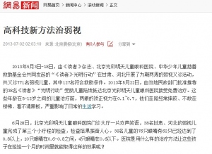 高科技新方法治弱视2013-07-022013年5月3日-18日,由《读者》杂志、北京光彩明天儿童眼科医院、中华少年儿童慈善救助基金会共同发起的“《读者》光明行动”在甘肃、河北开展了为期两周的弱视义诊活动,共义诊771名弱视儿童,其中127名符合救助条件。2013年5月22日,由当地民政部门批准推荐的38名《读者》“光明行动”受助儿童陆续抵达北京光彩明天儿童眼科医院接受免费治疗。这些年龄在5-12岁之间的儿童治疗前,两眼的矫正视力在0.1~0.7,他们走路经常摔跤、不敢走楼梯、看不清黑板,严重影响了日常的生活学习。 6月28日,北京光彩明天儿童眼科医院门诊大厅一片欢声笑语,38名甘肃、河北的弱视儿童完成了第三个小疗程的检查,检查结果振奋人心。38名儿童的76只眼睛有62只已经达到了0.8以上,10只眼睛在0.6-0.8之间,4只眼睛在0.6以下。医院是用什么样的治疗方法让这些孩子在短短一个月的时间里就能取得这样的效果呢? 北京光彩明天儿童眼科医院是一所专门从事儿童弱视研究和检查治疗的专科医院。医院院长、世界著名眼科专家李志升教授从事儿童弱视的研究诊疗工作35年,积累了丰富的临床工作经验。2008年,凝聚了他无数心血与智慧的新一代电脑自动调频激光弱视治疗仪研制成功。该技术获得国际发明专利、欧盟CE体系认证及国际准入。这一新技术无论是技术参数,还是治疗效果,都处于世界领先地位,将世界弱视治疗的技术水平向前提高了一大步。该技术是根据大脑视皮层、视神经传导路、视网膜感应等不同部位对信息的感觉、传导、加工等环节的治疗需求研制的,是集光、电、生物信息技术为一体的专门针对各种弱视治疗的高科技仪器。主要机理是自动变频激光及脉冲光串选择了眼睛视网膜椎体细胞最敏感的波长和最适合的光密度和能量,既增强椎体细胞的活性,又可改善局部微循环、增加新陈代谢。在此基础上,医院经过多年大量调研,根据临床需要及每个患者的不同情况,总结出一整套有针对性、个性化、系统的综合治疗方法,使患者不打针、不吃药、无痛苦、无副作用,视力在短时间内得到恢复。 十年来,医院应用此新方法,在帮助超过十余万门诊弱视病患儿康复的情况下,还免费救治了“老、少、边、穷”地区弱视患者5530人,取得了很好的社会效益并在海外同行中引起了高度关注。目前,这批甘肃、河北的弱视小朋友治疗30天了,已有86%的儿童脱离了弱视的困扰。再有10天,这批小朋友都可康复回家,和其他小朋友一样能够拥有一双清晰明亮的眼睛。 来源:北京晨报 原文地址:http://news.163.com/13/0702/02/92OAR7H600014AED.html
