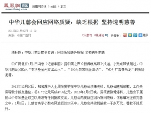 儿慈会回应"13项基金从未捐助"质疑:支出信息尚在更新2013-01-08中广网北京1月8日消息(记者陈振玺)据中国之声《新闻纵横》报道,刚刚经历了"小数点风波"的中华少年儿童慈善救助基金会,日前又被推到了风口浪尖。6日晚上,知名网络爆料人士周筱赟向媒体爆料,中华少年儿童慈善救助基金会下属的13个专项基金自成立以来,没有任何捐款支出。 中华儿慈会官方网站的"慈善捐款透明窗",公布了32个基金项目,大部分都列出了具体的支出明细,但有13个专项基金页面却一片空白,没有显示任何支出事项。1月6日,周筱赟以"少儿健康专项基金"为例,提出质疑。 周筱赟:这项基金在宣传资料上说,是给贫困地区的少年儿童义诊,送医送药等。但是这项基金在2011年成立后的支出是71万元。其中2011年度的支出是68万元,竟然宣传广告费用占了60万元,直接用于受助人的款物竟然是空白。也就是说,这项基金成立至今直接用于受助人的钱是零,发放的物资是零。 没有捐款支出项的基金包括"少儿健康专项基金"、"云南彝良地震救灾"等13个项目。另外,周筱赟还将质疑的矛头指向了一笔300万元的资金。 周筱赟:我就发现他们在2011年1月5日单单这一天,就有三笔各一百万,共计300万的巨额的现金支出。这三笔不是他们的捐款支出,其次不是他们的人员工资支出,也不可能是他们购买的固定资产。所以这三百万神秘的现金流出到底是什么,他们至今无法解释。 如周筱赟所说,儿慈会此前并没有在公示栏中对这笔资金的去向做出说明。那这13项基金是不是真的没有向外捐款?吸收的资金又为何不知所踪?记者昨天致电儿慈会,儿慈会办公室的一位工作人员这样回应。 儿慈会:这个是基金会今年刚改版,有些数字还没往上写呢。这是个误解。 中华儿慈会表示,关于具体某些基金会的捐款支出问题,他们将通过官方网站和微博尽快发布相关信息。 儿慈会:我们今天或者明天会把相关的信息,一些公告的东西向网民展示的。 记者:哪方面的信息呢? 儿慈会:周筱赟不是提了一些问题吗,我们会回答的。 记者了解到,在周筱赟的质疑声通过媒体公布的几乎同一时间,中华儿慈会也已经于1月6日在其官方网站上发布公告,名称为《关于中华儿慈会2011年度银行理财行为等事宜的相关法律声明》。但周筱赟并不认可这一份声明。他认为,儿慈会的这次声明并没有解释"专项基金为什么没有捐款支出"的问题,《声明》只是对较早前提出的"洗钱"问题做出回应,而且站不住脚。 周筱赟:根据民政部颁发的《基金会管理条例》以及中华儿慈会自己的章程,超过50万元以上的投资项目都必须经过理事会决议三分之二以上通过才能够进行。而中华儿慈会竟然拿出了6500万的善款,去做短期银行理财投资券,去收利息去了,没有经过理事会决议,根本就是违反《基金会管理条例》的。它现在这个所谓的《法律声明》的意思是说,它这个行为完全合法。 在微博上,周筱赟把这次的公开质疑称为"中华儿慈会涉嫌违法第三季猛料"。此前,他曾指责儿慈会涉嫌洗钱和财务造假。他透露说,接下来还将继续指出中华儿慈会的更多财务问题。周筱赟的质疑之声来势汹汹,中华儿慈会也并没有"忍气吞声"。 昨天晚上7点48分,中华儿慈会终于在其官方微博和官方网站上正式发布公告,名为《中华儿慈会项目及专项基金规范实施》。在这篇近两千字的公告中,中华儿慈会就网民周筱赟提出的三点主要质疑逐一回应。就"某些基金捐款支出项出现空白"的问题,儿慈会回应称,"基金会网站改版不久,项目支出信息公示尚处于更新过程中"。儿慈会办公室负责人进一步解释。 儿慈会:比如说有些资金进来以后,我们经过后台要把东西转到前台,然后再上到我们的官方网站,这需要时间。不能是单独有一个进来的东西就能说明任何问题。我们进来每一笔都在我们的官网上都有显示。这不容有什么质疑的。 而对于"60万元的广告宣传费用"问题,中华儿慈会解释说,这是"广告公司捐赠的市值60万的广告位,属于非现金捐赠形式",这笔资金涉及的"少儿健康专项基金"也一直都在运营,项目的开展情况在官网有公示。另外,中华儿慈会提出,"300万元的所谓神秘资金属于项目正常支出"。中华儿慈会办公室人员对此回应称: 儿慈会:这甭说300万元了,就一分钱进来后出现问题,网民都不会(放过的)。这我们不会犯错误的。 《公告》的最后,中华儿慈会还刊出一段"小结":"基金会公开透明不只是提高公信力,以获得更多的捐赠,更多的是要对每一个捐赠人负责。同时,公开透明也是基金会内部治理的需要。中华儿慈会十分欢迎,也十分重视公众的监督。" 作为普通的民众,中华儿慈会的项目基金使用是否合规合法,除了会计师和律师外的大多数人都可能无从得知。但至少我们看到,网民报料人周筱赟的持续质疑加速了慈善组织的透明化。我们也看到,中华儿慈会在面对质疑时并没有一味躲避,而是选择以更开放的态度来改进工作。 昨天的另一则新闻,"11月15日,广东省慈善总会作为发起人之一的一场募捐活动,号召各界为西部山区孩子捐款捐书。但活动发起一个月后,只募捐到100元。"1个月和100元,两个数字可能刺痛着我们慈善事业从业者的爱心,但这也从侧面说明,我国慈善机构的公信力正面临考验,慈善事业处在危险的边缘。我们希望,包括中华儿慈会在内的更多公益慈善机构,能够
