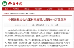 中国道教协会向玉树地震孤儿捐赠110万元善款2012-09-202012年9月18日,中国道教协会牵手中华儿慈会,在北京白云观举行慈善捐赠活动,向在京学习生活的玉树地震孤儿捐款110万元人民币善款,同时还启动“点亮心灯•光明行动”,募集善款为贫困家庭的少幼儿治疗眼疾。捐赠活动以及启动仪式结束之后,道教界人士还为此专门举行了祈福法会。 国家宗教局副局长蒋坚永,中华少年儿童慈善救助基金会理事长魏久明,中国道教协会副会长张继禹、黄信阳、唐诚青、张凤林及秘书长王哲一等出席活动。据中国道教协会副会长张继禹介绍,本次活动是为落实中国宗教界在全国范围内开展“宗教慈善周”活动的倡议,深入推进道教慈善事业发展而举行。 今年2月,国家宗教局联合中央五部门发布《关于鼓励和规范宗教界从事公益慈善活动的意见》。9月17日,以“慈爱人间,五教同行”为主题的“宗教慈善周”启动仪式在湖北省武汉举行,中国宗教界发出《关于开展“宗教慈善周”活动的共同倡议》,商定9月17至23日在全国范围内联合开展相关慈善活动。据悉,这是中国宗教界首次在全国范围内联合开展的公益慈善活动。 道教历来有着齐同慈爱、济世利人的优良传统。中国道教协会以慈善周活动为契机,旨在推动道教界开展公益慈善活动的长期化、制度化和规范化,发挥道教界人士和信教群众在促进社会和谐、经济发展和文化繁荣中的积极作用。 9月18日的活动有两项内容,分别为“中国道教牵手玉树地震孤儿捐赠活动”和“点亮心灯•光明行动——慈善助医活动启动仪式”。 张继禹介绍,2010年玉树地震后,中国少年儿童慈善救助基金会将符合条件的80余名孤儿带出灾区,并将其中63名安置在北京生活学习。为体现全国道教界对玉树灾区民众的关爱之情,中国道教协会向该基金会捐款 110 万元,用于支持在京玉树灾区孤儿的生活和学习。 另一项活动由北京市道教协会弘道济世基金发起,依托“首届中国道家艺术名人书画展”,组织名家作品进行慈善拍卖,将募集到的善款用于救助贫困家庭的少幼儿眼疾患者。治疗的捐赠活动和启动仪式结束后,道教协会还举行了祈福法会,祈祷各位善心人士和孤儿、少幼儿眼疾患者身体健康、万事如意。 国家宗教局副局长蒋坚永表示,道教界从事公益慈善活动有着悠久的历史和传统,“希望道教界继续发挥道教界人士和信教群众的积极作用,传承道教的优良传统,在构建和谐社会和促进经济发展中做出更大的贡献”。 来源:今日中国 原文地址:http://www.chinatoday.com.cn/ctchinese/news/article/2012-09/19/content_484391.htm