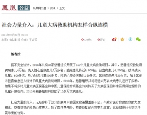 社会力量介入:儿童大病救助机构怎样合纵连横2014-07-31编者按 据不完全统计,2013年共有96家慈善组织开展了149个儿童大病救助项目。其中,慈善组织救助唇腭裂患儿4万名,先天性心脏病患儿3万多名,脑瘫患儿将近9,000名,白血病患儿4,300名,肢体残疾儿童1,600多名,听力残疾儿童900多名,救助了烧烫伤患儿140多名,其他疾病患儿30万名,加上其他未披露信息进入统计的儿童大病救助项目,2013年,慈善组织共对将近40万名大病患儿进行了救助。如果不将乡村儿童大病医保基金和中国儿童保险专项基金为其购买了大病医保但并未获得保险理赔的儿童计算在内,2013年慈善组织共救助了10多万大病患儿。 社会力量的介入,无疑弥补了部分疾病尚未被国家政策覆盖的不足,与政府医疗救助的救助力度相比,慈善组织的救助力度更大,除了医疗费用外,慈善救助的内容更为丰富。这些都是社会组织所展示出的优势。 然而,社会组织也会在救助过程中,依然暴露出诸多不足和问题,儿童大病慈善救助也面临着资金募集难度大、专业人员缺乏、为患儿提供专业服务能力不足、慈善组织之间缺乏互动与衔接等基本挑战。 目前的慈善组织大部分都独立运作,缺乏有效的信息沟通方式。就不同疾病的大病救助而言,缺乏统筹会导致救助资源集中于某几种病种,造成一些疾病救助资源不足,另一些疾病的救助资源过剩;就同一种疾病患儿的救助而言,缺乏统筹会存在过度救助的可能性,而患儿及家长在了解不同慈善组织的救助标准以及准备申请资料的过程也需要时间。 7月22日,由中国红十字基金会、北师大中国公益研究院联合主办的第二届中国儿童大病救助论坛在京举行。论坛发布了《中国儿童大病医疗保障与社会救助分析》报告,并就加大儿童大病救助扶持力度、打造儿童大病救助联合平台等进行了探讨。 现状:异地就医普遍 流动儿童医保问题突出 《中国儿童大病医疗保障与社会救助分析》报告(以下简称《报告》)指出,当前全国儿童大病医疗保障面临三大挑战。首先是基本医保对重大疾病的实际报销比例有限。数据显示,基本医保的报销比例在20%-45%,超过20万元以上医疗费用的疾病实际报销比例还会更低,有超过70%的参保农民和参合居民仍未被可以提供大病医疗费用二次报销的城乡大病医疗保险覆盖。其次,儿科医疗资源短缺且不均衡导致儿童大病异地就医非常普遍,而医疗保险县级统筹与异地就医需求之间存在矛盾,导致报销比例进一步降低,且就医和报销流程非常复杂。第三,流动人口参保制度建设滞后,上千万流动儿童医保问题突出。据统计,2012年我国0-17岁城乡流动儿童约有3581万人,其中跨省市流动儿童有1078万名,流动人口的参保率仅44%。 国家卫计委基层卫生司副司长聂春雷在论坛上介绍,2010年,原卫生部会同财政等部门,从儿童先心病、白血病两个病种入手,开展了重大疾病保障工作,实际医疗费用报销70%,符合救助条件的,再由医疗救助补偿20%。2013年纳入大病保障病种已经扩至22种,包括多种与儿童有关的重大疾病。部分省市还探索将儿童神经性耳聋、人工耳蜗植入纳入大病保障范围。 从2012年起,卫计委指导各地,利用新农合基金向商业保险机构购买大病保险试点工作,在参合大病患者中,发生高额医药费用情况下,新农合报销结束以后,由大病保险基金对家庭难以负担的部分还给予一定的补偿。截至2014年5月底,全国50%以上的县市区已启动大病保险工作,覆盖人口2.97亿,大病患者实际报销比例在新农合原报销的基础上,提高了12个百分点。 政策: 公益救助怎样与体系结合 在政府搭建的医保体系尚难以全面保障的背景下,以社会资源为主的公益慈善救助成为解决儿童大病医疗难题的一个重要补充资源。《报告》显示,2013年,全国90多家慈善组织共开展了将近150个儿童大病救助项目,对10多万各类重大疾病患儿进行了专业有效的救助,弥补了部分疾病尚未被国家政策覆盖的不足;其中,对不区分病种的多种疾病的综合救助项目数量最多,占25%。专项救助项目中,先心病、白血病、唇腭裂的救助项目数量最多,分别占比24%、12%和10%;从项目的救助规模来看,针对白血病、脑瘫、残疾儿童的项目规模大部分集中在0~50人,规模较小,而针对先心病患儿的救助项目,已有部分项目达到中等规模。慈善救助具有及时性、多样化的优势,同时能促进社会资源的有效流动。国家近年来彩票公益金对儿童大病救助项目的支持,已经发挥了较好的推动示范作用。 北京大学教授、国务院医改专家咨询委员会委员李玲说,现在的医保、医疗、医药、民政,还有公益机构,呈现出碎片化的格局,体现在儿童方面,一个家里的孩子得病了,得四面去求救,跪在路上的也有,网络上的也有。 对于公益慈善怎样与政府的社会救助政策相结合,爱佑慈善基金会副秘书长蒋昭华介绍了他们的经验。在2009年之前,爱佑一直都是在做独立资助,没有办法和政策相结合。“这对我们来说是很大的困扰。”蒋昭华说,“2010年之后,我们与新疆生产建设兵团签订了一个合作协议,他们支持55%-60%的治疗费用,爱佑承担剩余部分,所以这些儿童的大病治疗全部由公益组织和政府来承担。江西省也是,我们和革命老区基金会还有他们卫生部门、民政部门几方联合。” 现在的新政策每个省的做法都不一样,这对公益机构来说是一个很大的困扰,有的地方