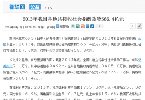 2013年我国各地共接收社会捐赠款物566.4亿元2014-06-20新华网北京6月17日电(记者孙铁翔)据民政部17日印发的《2013年社会服务发展统计公报》显示,2013年,我国各地共接收社会捐赠款物566.4亿元。其中,民政部门直接接收社会各界捐款107.6亿元,各类社会组织接收捐款458.8亿元。 《公报》显示,在慈善捐赠方面,截至2013年底,全国共建立经常性社会捐助工作站、点和慈善超市3.1万个,其中慈善超市9492个。全年各地接收捐赠衣被10405.0万件,捐赠物资价值折合人民币8.7亿元。间接接收其他部门转入的社会捐款5亿元,衣被739.1万件,捐赠物资折款35081.4万元。 在福利彩票方面,2013年,我国福利彩票年销售1765.3亿元,比上年增加255.0亿元,同比增长16.9%;筹集福彩公益金510.7亿元,比上年增长13.6%;我国民政系统共支出彩票公益金195.5亿元,比上年增加36.5亿元,其中:资助用于抚恤7.5亿元,退役安置0.6亿元,社会福利117.1亿元,社会救助26.1亿元,自然灾害2.6亿元,其他41.6亿元。 来源:新华网 原文地址:http://news.xinhuanet.com/gongyi/2014-06/19/c_126638542.htm -