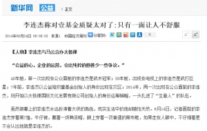 李连杰称对壹基金质疑太对了:只有一面让人不舒服2014-06-24【人物】李连杰与马云合办太极禅 “公益的心,企业的运营,会比纯粹的慈善少一些争议。” 40年前,第一次出现在公众面前的李连杰是武术冠军;30年前,出现在电视上的李连杰是武打巨星;7年前,李连杰以公益组织壹基金创始人的身份出现在灾区;2014年,再一次出现在公众面前的李连杰,则开始以太极禅国际文化发展有限公司创始人的身份运筹帷幄,一头扎进了“生意人”的队伍。 虽然银幕上的李连杰永远扮演着大侠的角色,现实生活中的他却随性天然。6月14日,记者面前的李连杰穿着黑T恤,牛仔裤,戴着一顶鸭舌帽,脚上穿着一双普通的黑布鞋,如果走在人群中,不仔细看是不会认出他就是李连杰的。 在接下来接近一个小时的采访时间里,李连杰一直保持着同样的坐姿:双腿在小腿以下交叉,一只脚踩在另一只脚上。采访过程中李连杰不时变换着双脚,看上去随时想把双腿盘起来坐在沙发上。 对于熟悉中国武术的人来说,盘膝而坐是他们最自然最舒服的一种坐姿。或许对于李连杰来说,不论身份如何变换,他的人生主题始终没有变过。如今的李连杰将“人人公益”摆在了最重要的位置,并创立“太极禅”来推广健康快乐的理念。 壹基金: 从“李连杰标签”到“去李连杰化” 就像“少林寺”、“黄飞鸿”一样,李连杰用7年的时间,把“壹基金”淬炼成了一枚个人标签,提到李连杰,就会想起他的壹基金,和他的慈善事业。 壹基金的创办源于2004年12月印尼那场全球百年以来最大的海啸。带着家人在马尔代夫度假的李连杰意外遭遇了这场劫难。在亲眼目睹了大自然灾害的力量后,劫后余生的他产生了创办壹基金的想法。 2006年12月,《满城尽带黄金甲》的首映礼上,李连杰带着他的 “壹基金”计划第一次出现在公众面前。他一次次地感谢,一次次地鞠躬,恳请现场嘉宾、媒体和观众支持慈善事业。 2010年12月,壹基金向深圳市民政局提出的登记申请终于获批,成为中国首家成功“转正”的民间公募基金会(即面向公众募捐的基金会)。4年来,壹基金在公众面前的形象似乎越来越具有公信力。但是,有了“合法身份”的壹基金又迎来了新的麻烦,日益增长的捐款后面是公众越来越高的质疑声。 面对种种质疑,李连杰认为非常正常,“质疑太对了!怎么能不质疑?就好像太极的阴阳,只有一面都会让人不舒服。你见过有谁不被质疑过?” 变身公募基金会后,对待壹基金身上的“李连杰标签”,李连杰更希望公众记住的是壹基金,而不是他本人。“谁是李连杰并不重要,壹基金永远传承下去,这样才是可持续发展模式。”李连杰说。 2013年,李连杰在接受《中国经济周刊》采访时曾经强调,走向公募就要“去李连杰化”。“刚开始的时候,需要用我的无形资产去推动。走到一定的阶段,需要去掉个人化,用制度去推动组织的进步。把李连杰的名字拿掉,将壹基金打造成集体领导的、透明专业高效的机构。”现在的李连杰是壹基金理事会的理事之一,但已不再插手具体事务。 李连杰对今天的壹基金很满意。6月14日,他向《中国经济周刊》表示,“壹基金可以推动中国公益事业和国际接轨提早5年到10年。但在壹基金我已经不再处理日常的运营事务,我的角色是不断做一个志愿者去参与,不会牵涉我太多精力,我现在的工作重心是太极禅。” 李连杰: 我不是企业家,只是太极文化推广者 在壹基金的理事会成员名单中,最引人瞩目的是一系列商界大佬的名字:柳传志、王石、冯仑、马云、马蔚华等等。也正是从壹基金开始,李连杰结识了马云。2011年,两人一同注册了“太极禅国际文化发展有限公司”。 马云对太极的迷恋可谓人尽皆知。不久前的一次活动上,马云曾经笑称,自己从阿里“功成身退”以后,还有“三大事业”:教书,做环保,练太极拳。 李连杰告诉《中国经济周刊》,太极对他的影响可以追溯到1982年他拍摄《少林寺》的时候,但是武术产业化的想法是在他去美国以后形成的。事后他和马云探讨这件事情,两人一拍即合。 “中华武术扬名海外,但是我们的武馆往往是以作坊的方式存在的,和国外的瑜伽、跆拳道相比,人家的产业化比我们高很多。我就一直在思索原因。”李连杰告诉《中国经济周刊》,“后来我发现这和我们的文化有关系。中国的文化太博大精深了,学无止境,学到了一个什么程度很难说清楚。所以我们要把太极文化产业化,把它推向全球,就要把它标准化、制度化,让客户清楚地知道,你花了多少钱会学到多少东西。” 之前外界曾经传言,李连杰将担任太极禅国际文化发展有限公司CEO一职。但是在2014年正和岛岛邻大会举办的“太极禅之夜”活动上,李连杰告诉《中国经济周刊》,担任太极禅国际文化发展有限公司CEO一职的是依文企业集团董事长夏华。 夏华告诉《中国经济周刊》,未来太极禅产业化的实施落地将由她来执行。她对太极禅的发展非常有信心。她向《中国经济周刊》透露,她和马云及李连杰第一次为太极禅一起开会的时候,马云告诉她说,太极禅就是别人做不了的东西我们都要做,别人做不好的东西我们要做到最好。 李连杰并不认为他将太极文化产业化之后就成为了企业家,他认为自己只是太极文化的推广者。 “我一直在说,我只是一个分享健康与快乐的人,我做太极禅,也是为了做公益。” 在李连杰看