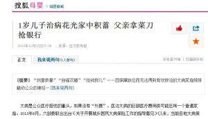 1岁儿子治病花光家中积蓄 父亲拿菜刀抢银行2013-11-22大病是公众医疗担忧的重头,如果没有“外援”,医治大病的巨额医疗费用很可能压垮一个普通家庭。2012年8月,六部委联合出台《关于开展城乡居民大病保险工作的指导意见》以来,当前各地大病保险试点进展总体有序,实现了群众减负担、政府提效率、医院降风险的三方利好。11月20日,重庆市政府发布《重庆市城乡居民大病保险暂行办法》,今年1月1日起,城乡居民医保参保人员可享受大病保险待遇,全年最高可补偿20万元。但一些地区、政府部门对推进大病保险仍有种种疑虑,加之现行医保制度存在的城乡分割、三保分立(城镇职工基本医保、城镇居民医保、新农合)等状况,有的地方在实施政策启动之初就出现与国家指导意见不一致,存在“跑偏”倾向。 多位专家建议,各级政府相关部门应统一思想,打破部门利益的狭隘观念,积极推动城镇职工医保、城镇居民医保、新农合“三保合一”,消除大病保险的先天不足,促进大病保险事业健康可持续发展。 “等不起”的大病医保 截至10月底,全国已有23个省区启动城乡居民大病保险工作,共有9家保险公司开展了相关业务,2.1亿群众可从中受益。但是,仍有许许多多大病家庭“等不起”大病医保的实施,酿成了一起起悲剧。 日前,一对贵州夫妻1岁的孩子被樱桃卡住气管后深度昏迷,抢救了一个月仍未好转。家里的钱花光后,为了救儿子的命,年轻的父亲竟然拿着菜刀和扳手去抢银行。 今年7月31日,一位3个月大的胆道闭锁患儿被家长丢在了上海仁济医院的便池旁,希望医院能给孩子做手术。“像这样的案例去年我们就接到了603份,分布在全国各地,包括胆道闭锁、烧烫伤等51类病种。”中华少年儿童慈善救助基金会天使妈妈基金办公室邱莉莉说。 这再次引起公众对居民大病保险的关注。去年8月,发改委、原卫生部、财政部等六部委联合下发《指导意见》后,部分地区陆续出台推行居民大病保险的“时间表”和“路线图”,多省区依照“收支平衡、保本微利”原则,加大投入并因地制宜采取政府委托购买服务的方法,支持商业保险机构承接大病保险。在不增加群众缴费负担情况下,利用市场机制放大基本医保基金保障效用。 国家卫生和计划生育委员会体制改革司(国务院医改办)副司长姚建红介绍,尽管总体上大病保险工作进展顺利,但各地不平衡状况比较突出。据了解,河北等16个省(区)要求2013年在部分地区开展城乡居民大病保险试点工作,在2014年或2015年全面推开;辽宁等7个省(区)已要求在全省推开大病保险工作。 11月20日,重庆市政府网发布《重庆市城乡居民大病保险暂行办法》。根据办法,今年1月1日起,城乡居民医保参保人员可享受大病保险待遇。按照起付标准不同,报销将分三段累进补偿,报销比例分别为40%、50%、60%,全年最高可补偿20万元。 数据显示,2010年我国城乡医疗救助支出总量为133亿元,其中城市医疗救助支出超过49亿元,平均每人每次仅获得257.7元;农村医疗救助支出83.4亿多元,平均每人每次只获得148.2元。对数目巨大的医疗费用而言,有限的医疗救助过于微薄,如果没有基本医保、大病保险等前端制度的衔接,医疗救助只能是“杯水车薪”。 地方执行政策出现“拉偏车” 当前各地大病保险试点进展总体有序,但一些地区、政府部门对推进大病保险仍有种种疑虑,加之现行医保制度存在的城乡分割、三保分立(城镇职工基本医保、城镇居民医保、新农合)等状况,有的地方在实施政策启动之初就出现与国家指导意见不一致,存在“跑偏”倾向。 从推进现状来看,一些地区与六部委发布的《关于开展城乡居民大病保险工作的指导意见》(以下简称《指导意见》)主要存在三方面不一致: 统筹层次不一致《经济参考报》记者采访发现,大部分省份采取市级统筹,仅有吉林、西藏、甘肃、青海实行省级统筹。但《指导意见》要求“可以市(地)级统筹,也可以探索全省(区、市)统一政策,统一组织实施”。“以县为统筹单位就突破了六部委文件的底线。根据保险的大数法则,一旦统筹单位过低,风险就难以分散转移,不利于大病保险发挥作用。”对外经贸大学保险学院博士王琬说。 承办主体不一致。《指导意见》明确城乡居民大病保险的承办方式为向商业保险机构购买大病保险,但在实际操作中并非如此。比如东北某省提出,城乡居民大病保险将由医保机构承办,而参合农民大病保险则采取向商业保险机构购买服务的方式。 信息衔接不一致《指导意见》规定,必要的信息交换和数据共享对完善大病保险的服务流程、简化报销手续至关重要。实际上,部分地区医疗机构、医保机构信息系统建设严重滞后,新农合、城镇居民医保、城镇职工医保信息系统标准不一,信息资源难以联通。保险公司承办当地大病保险后,为满足实时监控医疗行为、即时结算医疗费用等需要,必须投入巨大的人力、物力进行信息系统改造和整合。还有一些地方甚至对保险公司使用相关信息数据采取抵触态度。 据介绍,保险公司投标时应依据发病概率、医疗费用、人口规模等综合因素做出科学测算,但是很多保险公司为了抢占市场,竟然“拍脑门”定价。恶性竞争使得一些经验丰富的专业健康险公司无法中标。 利益藩篱加剧纸上谈“病” 大病保险引入商业保险机构承办,打破了现行医保运作