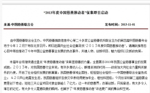 “2013年度中国慈善推动者”征集即日启动2013-11-05由中国慈善联合会主办,中民慈善捐助信息中心等二十多家公益慈善机构联合主办的第四届中国慈善年会将于今年12月下旬在北京召开。即日起面向全社会征集寻找“2013年度中国慈善推动者”,请踊跃推荐您心目中那些推动了今年中国公益慈善事业发展的热点事件、关键人物、创新项目、魅力组织以及新政良策。 本届年会将继续通过盘点“年度慈善推动者”来彰显慈善的力量,全面展示2013年我国公益慈善事业的发展成就。2013年,对我国慈善行业来说,有许多激动人心、群情澎湃的时刻——政府加大向社会力量购买服务的力度,开启了社会组织发展的新篇章;我国慈善领域全国性、枢纽型社会组织——中国慈善联合会宣告成立; 420芦山地震发生后,我国慈善组织在救灾中表现得更加专业、理性和团结;9月份深圳第二届慈展会更是创下奇迹,短短三天公益项目对接金额逾17亿元。这一年的慈善界,改革创新,开拓奋进,有太多令人难忘的记忆,有太多令人震撼自豪的瞬间,也赋予了“年度慈善推动者”评选更广阔的舞台和空间。 本次征集活动截止时间为2013年11月20日。大家可拔打活动热线电话010-83520774-8219进行咨询,或下载附件中的推荐函填写后发送电子邮件至npo@charity.gov.cn。届时,主办方对推荐材料进行初步筛选后,将组成评审团,秉着公平、公正的原则,评选出最终的年度慈善推动者。 来源:中国慈善联合会 原文地址:http://www.charity.gov.cn/fsm/sites/newmain/preview1.jsp?ColumnID=362&TID=20131101173026403939453 -