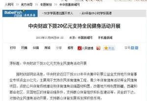 中央财政下拨20亿元支持全民健身活动开展2013-11-08据财政部网站消息,中央财政近日下拨2013年中央集中彩票公益金支持地方体育事业专项资金20亿元,主要用于支持农民体育健身工程、青少年体育健身活动等全民健身项目,资助公共体育场地建设和体育健身设施器材购置,改善地方特别是新疆、西藏和革命老区、贫困地区的体育设施条件,支持群众体育组织和队伍建设等。资金的下达,对推动全民健身活动开展、支持群众体育发展将发挥积极作用。 根据《财政部关于印发<彩票公益金管理办法>的通知》(财综〔2012〕15号)和《国家体育总局、财政部、中国人民银行关于印发<体育彩票公益金管理暂行办法>的通知》(体经字〔1998〕365号)有关规定,中央集中彩票公益金支持体育事业专项资金主要用于落实《全民健身计划纲要》和《奥运争光计划纲要》,资助开展全民健身活动,弥补大型体育运动会比赛经费不足,修整和增建体育设施,以及体育扶贫工程专项支出等。 来源:中国新闻网 原文地址:http://ccn.people.com.cn/n/2013/1106/c366510-23446522.html -