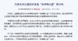 百家民间公益组织发起“自律晒公益”微行动2013-08-198月9日,由壹基金联合USDO自律吧发起的“自律晒公益”行动正式启动,超过百家民间公益组织将通过官方网站和微博等新媒体渠道主动披露自身的机构信息。 中国的经济发展令世界瞠目,社会公众参与公益活动的热情日渐高涨,公益话题越来越受到重视,但中国民间公益组织的可持续发展却面临巨大挑战。而公益组织面临的最大一个挑战,就是社会公众对于专业公益组织的了解不足,尤其是对公益组织的公信力存在很大疑问。 为了进一步推进民间公益组织的信息披露,2013年壹基金联合USDO自律吧,南都公益基金会、北京市企业家环保基金会以及中国发展简报、中国公益研究院、基金会中心网等多家公益单位加入,共同启动民间公益透明行动之“自律晒公益”活动。 活动将在2013年8月26日至9月6日期间,联合超过一百家以上的民间公益组织通过官方网站、官方博客、微博等渠道披露机构介绍、组织管理、公益项目和财务信息。“自律晒公益”行动倡导公益行业联动,利用互联网及新媒体,规模化开展信息披露活动,向社会公众展现一个公开、透明、诚信自律的公益行业。 透明是有效沟通,建立信任的关键。活动除了展现机构的信息披露,还将通过与知识型问答社区知乎网合作,通过问答和点评的方式与公众互动公益组织信息背后的内涵,了解公益透明的边界、公益行业的现状和分享公益组织透明案例,达成和公众的沟通和理解。为此,公益资讯APP“公益壹点通(知乎日报特别版)”也于同日上线,用户可通过这款APP在阅读新闻资讯的场景下,轻松关注新鲜的公益信息,了解广泛的公益知识。 2013的这个夏天,让我们一起“清清楚楚做披露”,让公众“明明白白看公益”。 “自律晒公益”活动将持续一个月,并将于8月16日在北京中国公益研究院举办线下沙龙。届时,公益组织、媒体和公众将面对面,就公益组织的透明话题展开讨论。 用行动来说服你,我们的捐赠人! 活动专题链接: http://pilu.chinausdo.org/index.php/Topic 来源:新浪公益 原文地址:http://gongyi.sina.com.cn/gyzx/2013-08-09/151244747.html -