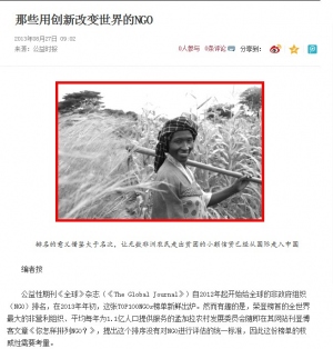 那些用创新改变世界的NGO2013-08-27公益性期刊《全球》杂志(《The Global Journal》)自2012年起开始给全球的非政府组织(NGO)排名,在2013年年初,这张TOP100NGOs榜单新鲜出炉。然而有趣的是,荣登榜首的全世界最大的非营利组织、平均每年为1.1亿人口提供服务的孟加拉农村发展委员会随即在其网站刊登博客文章《你怎样排列NGO?》,提出这个排序没有对NGO进行评估的统一标准,因此这份榜单的权威性需要考量。 《全球》杂志方面则称编辑们参考三大指标来衡量组织:影响力、创新性和可持续性发展能力。但同时也强调,“尽管我们努力保证排名是根据具体的信息通过一个严格的、客观的过程,但没有科学的测量办法。” 尽管如此,这样的排名对于NGO的从业者思考自身价值、借鉴社会创新和提高工作效率还是颇有助益的,尤其是中国NGO对自身的反思。因为榜单中并没有中国NGO的身影,那么我们如何发展壮大、走进国际视野,看来,要走的路还很长。 基于版面有限,在这里我们将排名中的前三甲与大家分享。 BRAC 总部地点:孟加拉国 孟加拉国农村发展委员会:小额信贷发展世界 孟加拉国人多地少,环境恶劣,灾害频繁,是联合国公布的全世界最贫困的39个国家之一。但是,在这个贫穷的国度里,却活跃着一个超大型的跨国非政府组织——孟加拉国农村发展委员会BRAC((the Bangladesh Rural Advancement Committee)。几十年来,BRAC面向广大农村地区,坚持不懈地从事扶贫减贫工作,为孟加拉社会经济的发展做出了重要贡献,受到政府和民众的高度评价。孟加拉经济学家、小额信贷之父穆罕默德·尤努斯说:“让贫穷只存在于博物馆中吧!那时,我们的后代会惊讶地追问我们:什么是贫穷?” 该组织是由一位名叫法佐·哈桑·阿比德的孟加拉慈善人士于1972年发起成立的。那时的孟加拉国刚刚结束了艰苦卓绝的东巴战争而独立,边境地区聚集着大量的自印度返回家园的战争难民。阿比德和数十位同伴们一起,四处筹集食品和物资,向受难同胞们提供救济,利用有限的力量帮助国家和民众走出战争的阴影。 1978年,孟加拉人民生活渐渐好转,但多数人仍在为温饱而努力。在这个伊斯兰国家的农村地区,女性的政治和经济地位尤其低下,生活艰难。鉴于此,BRAC没有停下脚步,而是从战争救济转向扶助广大农村地区的贫民尤其是贫困妇女,开展大规模的扶贫减贫工作。它以自主经营为主,广纳善款,积蓄实力,向贫民提供微型贷款、经济救助、医疗保健、小学教育、就业培训等。阿比德等人坚信,在孟加拉这样的国度中,必须通过这些手段增强穷人的生存能力和政治意识,使他们认识到贫困并非是世袭和必然的,打破人们内心深处的贫困与绝望循环。 2004年,BRAC开支为2.45亿美元(其中77%为自营收入),所操作的各类项目惠及全国64个地区、78%村庄的近1亿人,对国内生产总值(GDP)的贡献率达到1.14个百分点,为全国创造了635万个就业机会,成为孟加拉国内政治和经济生活中一支举足轻重的力量。 当前,BRAC在全国设有1800多个办事机构,面向特贫、文盲、残疾和身患重病的人群,运营着经济发展、社会发展、人权与法律教育与服务、教育与健康四个核心项目。 经过三十多年的不懈努力,BRAC的教育与健康项目成就辉煌,并拥有总资产接近4亿美元,成为南亚地区公认的管理独立、财政自主的非政府组织的一个典范。据不完全统计,1985年以来,它从22个平均只有一间教室的小学开始经营,共建立了4.9万所5年制“非正式小学”(相当我国民办小学),吸纳学生100多万(其中女生占66%),占全国在校小学生总数的11%。作为教育与健康项目的一部分,BRAC还在全国农村地区创办了900多个图书馆,免费或以极低的费用向贫民开放。BRAC的医疗健康、营养和人口项目以传染病防治、妇幼保健为主,截至2011年在全国建立了48个健康中心(医院)和51个医疗诊断实验室,覆盖全国80%的人口。其对农村地区的渗透和影响力超过了孟加拉国家卫生部。 Wikimedia Foundation 总部地点:美国 维基媒体基金会:励志包围全球知识 “我们的使命,就是为每个人提供免费的知识,一个免费的为地球上每一种语言而打造的百科全书,并且通过互联网,它会是令人难以置信的花费。”互联网企业家和维基百科的创始人之一吉米·威尔斯这样说。 的确,维基百科已经成长为全球第五大访问网站,并成为最有影响力的免费在线百科全书。威尔斯在2003年成立了非营利的维基媒体基金会,以支持维基百科及其姊妹项目,包括负责维基百科、维基词典、维基语录、维基教科书、维基文库、维基物种、维基新闻和维基共享资源。 维基媒体基金会的旗舰项目便是无处不在的在线百科全书“维基百科”。2001年1月正式启用至今短短十几年中,它已经彻底改变了知识的收集和共享,成为一个拥有285种语言、超过1,100万条条目的在线百科全书,根据各地所有互联网用户开放访问,这是对维基全职编辑和超过100,000名志愿者组成的“更新大军”的承诺。 今天,维基媒体基金会也许在教育领域扮演着最有影响力的非政府角色。通过142名有限的工作人员负责管理其平台,却促进共享知识在人类历史上规模最大的集结,目前有共计23万篇文章,每月超过470万人浏览。 维基媒体基金会的未来战略的核心是扩大发展中和不发达国家的语言编译。维基百科的持续扩张,被看作不仅代表个人资产,而且还是公民获取信息从事