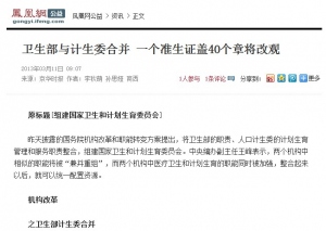 卫生部与计生委合并 一个准生证盖40个章将改观2013-03-11昨天披露的国务院机构改革和职能转变方案提出,将卫生部的职责、人口计生委的计划生育管理和服务职责整合,组建国家卫生和计划生育委员会。中央编办副主任王峰表示,两个机构中相似的职能将被“兼并重组”,而两个机构中医疗卫生和计划生育的职能同时被加强,整合起来以后,就可以统一配置资源。 机构改革 之卫生部计生委合并 方案内容 国务委员兼国务院秘书长马凯说,我国实行计划生育以来,计划生育事业取得历史性成就,有效缓解了人口对资源环境的压力。近年来,医疗卫生事业取得显著成绩。当前,计划生育工作需要在继续稳定低生育水平基础上更加注重提高出生人口素质,医疗卫生服务水平也需要不断提高。 为更好地坚持计划生育的基本国策,加强医疗卫生工作,深化医药卫生体制改革,优化配置医疗卫生和计划生育服务资源,提高出生人口素质和人民健康水平,方案提出,将卫生部的职责、人口计生委的计划生育管理和服务职责整合,组建国家卫生和计划生育委员会。 主要职责 统筹规划医疗卫生和计划生育服务资源配置,组织制定国家基本药物制度,拟订计划生育政策,监督管理公共卫生和医疗服务,负责计划生育管理和服务工作等。同时,将人口计生委的研究拟订人口发展战略、规划及人口政策职责划入发展改革委。国家中医药管理局由国家卫生和计划生育委员会管理。同时,不再保留卫生部、人口计生委。 改革后,我国坚持和完善计划生育政策,要继续坚持计划生育党政一把手负总责,继续实施计划生育一票否决制。国家卫生和计划生育委员会要高度重视计划生育工作,合理设置相关机构,充实工作力量,确保这项工作得到加强。地方各级政府要继续加强计划生育管理和服务工作,严格执行各项计划生育政策,确保责任到位、措施到位、投入到位、落实到位。 改革三问 一个准生证盖40个章将改观 为什么两部委要整合 中央编办副主任王峰接受采访时表示,合并后,两个机构中相似的职能将被“兼并重组”,而两个机构中医疗卫生和计划生育的职能同时被加强。他表示,两个部门职能相近甚至交叉。比如计划生育服务站和医院在生育方面的很多职能就有重叠。合起来,资源就可以得到优化了,总量相对不足的情况下,还把它分开。整合起来以后,就可以统一配置资源,进了接生服务站也可以看病,进了卫生院也可以接生。 北京大学人口研究所教授陆杰华表示,过去计生委是从卫生部划分出来的,现在回归到卫生部符合当前卫生和计生工作的发展需要,整合后将更有利于公共资源的利用,特别是对计生部门来说,原来计生委的主要职能是“四术”,即上环手术、取环手术、人流手术和引产手术,而当下为公众提供更好的优生优育服务是面临的新问题。就研究拟订人口发展战略、规划及人口政策职责划入发改委而言,陆杰华称,2003年,计生委曾改名叫人口和计划生育委员会,增加了宏观决策、发展战略发展规划等职责,和发改委有重合。 双方如何发挥自身优势 陆杰华认为,计生和卫生两大部门将在优化现有职能的同时,发挥自身资源优势,一方面,计生部门在全国范围内建立的服务网已较为健全成熟,可以起到服务网底的作用,提供信息资源;另一方面,除医疗服务外,作为卫生部门另一主要功能之一,公共卫生服务有技术和硬件优势,两者优势互补,即可在孕产妇的围产期保健、产后访视等方面提供更好的初级保健服务、降低新生儿和孕产妇死亡率,“过去偏远地区的初级保健中,计生委并没有这个职能”。 此外,“二合一”的整合势必将减少行政审批环节,办一个准生证盖40多个章,街道、卫生、计生等多部门来回“踢皮球”的情况也将得到改观。生育险和医疗险的接合也可以期待。 “目前,一些地区已经有了试点,取得了很好的效果”,陆杰华表示,部分乡镇因基层服务力量有限,已经先行将地区内的计生和卫生部门“二合一”。 是否是人口政策调整的信号 陆杰华称,坚持和完善计划生育政策是我国的基本国策,从未来一段时间来看,此方针不会改变,但为了更好适应新形势发展,如人口老龄化、群众对计生工作的需求等会有相关配套举措出台。 “要求新成立的部门,在内部机构设置、人员编制,包括职能配置上,确保计划生育的职能只能加强,不能削弱。不仅如此,地方做调整以后,对地方政府也会提出这样的要求。”王峰说。 陆杰华认为,随着大部制改革的推进,相关职能处室“合并同类项”也应该纳入考虑范围。他举例称,以计生委目前下设的流管司为例,目前农业部、人力社保部等也有对流动人口提供服务的职能,是否也应进行调整。由一个部门承担起流动人口和农民工服务和管理等职能,还需要“慢慢消化”。 官员解读 改革不会影响到医改 昨天,在谈到卫生部的改革时,卫生部副部长黄洁夫坦言,其中涉及人员岗位安排,希望大家以人民利益为重。 黄洁夫表示,卫生部将会面临重大的机构调整,一个是原来的人口和计划生育委员会,“这个要合并到卫生部,以后就没有卫生部了,可能叫做卫计委了吧”。另外,卫生部另外一块职能,则要跟药监局、食安办合并,所以卫生部有一部分要出去,有一部分进来。 对于改革涉及药品监管职能部门的变化,黄洁夫认为,这会影响到药品申请的流程和时间。“你看现