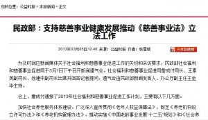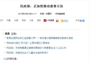 民政部:正加快推动慈善立法2013-03-15公益时报记者: 谢谢主持人,大家好,我是公益时报的记者。今年2月份国务院批转了发展改革委等部门《关于深化收入分配制度改革的若干意见》,其中包括大力发展社会慈善事业的内容,请问民政部门对此如何评价?如何落实这一要求?谢谢。 窦玉沛: 这次国务院在批转发改委等部门《关于深化收入分配制度改革的若干意见》中,把慈善作为收入分配制度改革的一项内容,我认为是提高了慈善的地位和作用。我们过去一提到慈善事业,就认为是社会保障的补充。进行社会主义道德建设、社会主义核心价值体系建设的时候,我们又把慈善、扶危济困、助人悦己作为道德和精神文明的范畴来弘扬。今天慈善进入了收入分配制度改革方面,这就说明它对于调节收入分配、缩小贫富差距、促进社会和谐发挥了更加重要的作用。所以说,这使我们对推动慈善事业的发展更加增加了责任感,而且这个《意见》提出来的措施非常具体,对于企业捐赠在年度利润总额中超出12%的部分,可以结转到以后的年份扣除。 关于进一步推动慈善发展,我们现在正在做以下几件事。第一,加快推动慈善立法。这个大家都非常关心,关于慈善立法在2005年民政部就开始推动,全国人大、全国政协每年两会的建议和提案涉及这方面非常多。国务院在2006年列入了立法计划,全国人大在2008年列入了立法计划。但是在研究这个文本的过程中,慈善涉及的范围还非常的广泛,大家的意见还不尽一致。我们现在一方面要继续推动慈善立法,为了加快解决当前存在的一些问题,我们也报请国务院争取可以出一个规范性的文件,用行政规制的手段来解决当前慈善事业存在的问题。第二,着力培育发展慈善组织。因为慈善组织是慈善事业发展的主体,根据这次对社团组织登记改革的精神,我想慈善组织在登记发展方面也遇到了一个春天。为了使慈善组织发展,我们马上要成立中国慈善联合会,作为慈善组织中的一个联合性的、枢纽性的,能够起到协调、互动、行业自律、行业维权的组织,进一步推动慈善组织的发展。 第三,我们还要创新慈善事业发展的体制、机制,包括一些形式。比如说,去年在慈善创新方面有几个亮点:比如在实践中创新出来的微慈善,就发挥了非常好的作用。有的企业在发展中搞了经营型的慈善,像宁夏的黄河善谷,采取企业投资兴业让残疾人就业的角度来发展慈善。有的企业留本冠名慈善基金,把本金留在企业,但是把利息部分拿给慈善组织来发展慈善。有的是采取捐赠股权的方式等等,这方面的创新是非常多的。第四,我们要进一步营造有利于慈善发展的氛围,弘扬慈善文化。一方面要继续办好今年的中华慈善奖,办好今年在深圳举办的善博会,同时今年要在南通开工建设中华慈善博物馆。谢谢。 来源:中国网 原文地址:http://gongyi.people.com.cn/n/2013/0313/c152509-20778045.html -