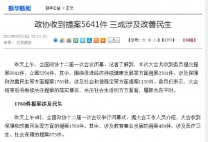 政协收到提案5641件 三成涉及改善民生2013-03-14昨天上午,全国政协十二届一次会议闭幕。记者了解到,本次大会共收到委员提交提案5641件,立案5254件。其中,围绕促进经济持续健康发展等方面提案2301件,涉及保障和改善民生等方面提案1760件,涉及社会和谐稳定等方面提案1130件。委员们表示,大会结束后将继续关注提案的落实情况,关注社会生活的方方面面,履职也在平时。 1760件提案涉及民生 昨天上午9时,全国政协十二届一次会议举行闭幕式。据大会工作人员介绍,大会收到保障和改善民生等方面的提案1760件。其中,涉及教育事业发展的提案489件,涉及医疗卫生、社会保障的提案673件。 委员建议,加快学前教育立法,制定未成年人保护法实施细则;合理调整农村中小学布局,提升特殊教育学校办学条件和师资水平;加快发展现代职业教育,支持民办教育发展,促进中西部高等教育振兴;完善少数民族地区高考政策,推进异地高考制度改革。 另外,委员还建议,加强城乡医疗和公共卫生服务体系、儿童医疗服务体系和重特大疾病保障、救助机制建设;扶持中医药和民族医药事业发展,加快中医药法立法进程;修改食品安全法,完善食品药品安全监管体制机制;支持社会养老服务体系和儿童福利机构建设,关爱农村留守儿童、妇女,做好“失独”家庭救助,解决失能老人养老难问题,完善失地农民社会保障制度。 建议继续加强污染防治 在围绕促进经济持续健康发展等方面的2301件提案中,涉及生态文明建设的提案458件。委员建议,加强重金属污染和大气污染防治,开展农村环境综合整治,推进国家重大生态修复工程和荒漠化、石漠化、水土流失综合治理;健全生态环境损害责任追究和补偿制度,加快资源环境保护法律体系建设。 在围绕促进社会和谐稳定等方面提出的1130件提案中,涉及政治法律、廉政建设的提案485件。主要建议有深化行政审批制度改革,加强政府投资、政府采购管理,推进行政权力公开透明运行;合理配置司法权,依法行使审判权、检察权,强化执法监督;制定个人信息保护法、预防职务犯罪法,严厉打击商业贿赂、网络诈骗等犯罪行为;切实改进工作作风,力戒空谈,反对浪费,勤俭办事等。 委员持续关注提案落实 大会闭幕式后,委员们冒着小雨走出人民大会堂。来自九三学社的全国政协委员许进表示,未来五年,我国的发展将面临严峻的挑战,期待人民政协在新一届领导班子的领导下,在政治协商和民主监督方面进一步发挥作用,团结更多人一道为实现中国梦而努力。 全国政协委员、民建中央组织部部长李世杰表示,在新一届政协将继续坚持求真务实的精神,相信委员的提案一定会得到落实。“因为委员们关心的、关注的都是切合民生的实际问题。” 另外很多委员表示,将持续关注提案的落实情况,关注社会生活的方方面面,履职也在平时。同时也欢迎群众对委员进行监督,这是政协委员履职的必要约束。 委员们还表示,在履职中要坚持真理、勇于直言,拒绝冷漠和懈怠。要实事求是,力求客观公正,厉行节约,用实际行动维护政协委员的良好形象。 晨报记者 王歧丰 来源:北京晨报 原文地址:http://news.xinhuanet.com/gongyi/2013-03/13/c_124451627.htm -