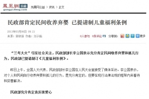 民政部肯定民间收养弃婴 已提请制儿童福利条例2013-03-06“兰考大火”引发社会关注,民政部部长李立国表示充分肯定民间收养弃婴和孤儿行为,民政部已提请制订《儿童福利条例》。 昨日上午,全国人大代表、民政部部长李立国在人民大会堂接受了媒体采访。李立国表示,对个人和民间自行收养弃婴和孤儿的行为,是充分肯定的,但要在现行法律法规的框架内来看待和妥善解决。 民政部充分肯定袁厉害爱心 去年,“兰考大火”一事引发社会对民间自行收养弃婴和孤儿的关注。李立国表示,“按照《未成年人保护法》和《民法通则》等有关法律法规的规定,对个人和民间自行收养弃婴和孤儿的行为,是充分肯定的。” 李立国在日前接受央视采访时也表示,类似袁厉害这样的个人和民间机构,他们自行收养弃婴和孤儿的爱心,民政部是充分肯定的。他还说,怎样对待民间机构自行收养孤儿,怎样追究遗弃儿童、不履行对儿童监护权等行为的责任,目前在法律中都缺乏明确的规定。民政部已经提请制订《儿童福利条例》,并要创造条件,适时提出修订与儿童权益保护有关的法律法规。 有媒体向李立国询问,是否可以公示我国民间自行收养孤儿及弃婴的详细数字。他回答道:“这个工作我们今年1月6日开展,民政部部署了一个月的排查工作,数据已经全部统计到位。”他透露:“据统计,我国民间自行收养的有878家,自行收养的数量是9394人,其中25%是个人自行收养的,还有60%多是寺庙等宗教机构收养的。 鼓励社会力量参与养老事业 养老话题一直都是两会热点,包括李立国本人也坦承:“这个话题很重要。”他透露,我国政府将吸引社会力量进入养老体系,进一步保障养老体系的健全与发展。 “中国将在社区和机构养老方面给予更多支持,力争在2015年前每千人床位由现在的20张提高到30张。”他表示,此举是为落实“十二五”中国社会养老服务体系建设规划,加快社会养老服务事业建设步伐。他强调,政府在养老体系不仅将继续加大投入,还将扩大优惠政策落实力度,“支持和鼓励社会力量参与社会养老事业,具体包括税收减免,对一次性投入与运营方面给予补助,以及在相关设施建设上提供政策优惠等。” 来源:凤凰网公益 原文地址:http://gongyi.ifeng.com/news/detail_2013_03/06/22789266_0.shtml
