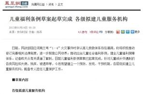 儿童福利条例草案起草完成 各级拟建儿童服务机构2013-01-15日前,民政部回应河南兰考“1·4”火灾事件时承认孤儿救助体系存在漏洞,称将积极推动修订完善相关法律制度,进一步鼓励公民收养;推动出台儿童社会福利条例,健全儿童福利保障体系。记者昨天从有关渠道了解到,目前儿童福利条例草案已起草完成,针对儿童成长中遇到的各类风险如大病、残疾、被遗弃等,今后有望建立一个预防、发现、干预机制,各层级拟建立儿童服务机构,配备专人担任儿童保护工作。 ■草案内容 各级拟建儿童服务机构 据了解,民政部于2010年启动了儿童福利条例的起草工作,并于去年完成初稿。中国青年政治学院教授、中国社会工作研究中心副主任童小军作为起草专家之一,一直参与其中。 在民政部社会福利和慈善事业促进司儿童福利处的组织下,众多专家们从2010年就开始致力于儿童福利条例草案的起草。至2012年下半年,经无数次讨论、修改,儿童福利体系的草案最终完成。 “只有有了机构和专门的人,才能更好地开展儿童工作。”起草过程中,童小军等专家建议,儿童福利条例中,首先应明确,要在各层级建立儿童机构以及人员的专业化、体制化,包括社区、区县等层级,最低一级设在社区或村庄,叫儿童服务中心,来开展儿童福利服务。 除了建立专门机构、设置专门的人员之外,童小军等专家建议,还要建立各个层级的协调委员会,该委员会包括各个部门,如卫生、医疗、教育、公安、司法等,以满足儿童的各种情况需求。同时,机构如何建立、承担责任、相应政策以及资金保障等,也应在条例中规定。 童小军认为,理想情况下,建立机构如上升到国家层面,就应设立国家级的儿童机构如儿童福利局。 据了解,参与起草工作的专家意见将在草案中予以体现。 记者同时了解到,十二五期间将力争在全国每个50万人口以上的县城都建立至少一个儿童福利机构。 社区将实现儿童风险预防 “由于不是立法,只是条例,所以其更多的应是预防。”童小军说,儿童最佳成长的环境就是家庭,所以要把所有在家庭中成长的孩子可能遇到的风险都要预防住,对每种风险都要有应对策略和服务,“这种预防的政策就是福利。” 童小军说,对于父母来说,儿童这个脆弱群体可能出现的风险,包括家庭贫困、失业、大病、服刑、逝世等等;对于孩子来说,则是孩子的身体状况和社会交往中可能出现的问题,如残疾、心理问题等等。 专家建议,条例应该明确儿童各种风险的预防、发现、干预机制,比如贫困、家庭暴力、辍学、大病、残疾、艾滋病儿童等儿童的各种情况,并针对这些风险给予相应补贴;其次,还应给予后续帮助,如治疗后的康复工作、教育等。 ■专家观点 儿童保护须国家层面立法 目前,尽管国家的各类政策已经为儿童拉上了一个网,但这个兜底的网“太破、漏洞太大”,所以才会不停地有孩子被伤害。 2011年,我国开始推行孤儿津贴政策,这一度被一些专家认为这一年是我国儿童福利开始的“元年”。 但童小军并不这么看,“儿童保护现在在我们国家基本没有概念,到现在儿童福利仍旧是一个空白。”童小军说,儿童作为一个权利的主体,没有一个整体的法律是专门针对这个群体的。目前针对儿童的法律有两部,一个是《未成年人保护法》,一个是《收养法》,但前者只是倡导性、理念性的,不具有操作性,且未成年人保护法找不到一个具体对应的执行部门。 除两部法外,我国还有针对儿童如孤儿、流浪儿童等各类政策,“这些政策解决的只是纯粹的问题,而不是从儿童的角度系统地真正地保护其成长。”童小军说。 在童小军看来,父母作为孩子的自然监护人,很多时候可能失能,比如遭遇意外、失业、精神病患者等,或孩子遭遇大病、残疾等情况,“这种情况下,是需要国家来兜底的,但现在大多是依靠家庭,国家的责任没有很好地限定。”童小军说,儿童成长的最佳环境是家庭,这就意味着国家应该给家庭最大的支持,帮助其完成让自己的孩子健康成长的责任和义务。 童小军说,儿童福利条例草案尽管已起草完成,但童小军认为这是远远不够的。“民政部只管儿童福利工作,只能做到这样(指起草儿童福利条例)。”童小军认为,儿童保护要立法,一定要通过国家层面来进行,且一定要细致到各层级人员该做什么。在儿童成长过程中,所有可能接触到的专业人员如教师、医生等及家庭监护人,国家都应该通过法律来规范这些人的行为,什么样的行为是不能做的,一旦做了将会面临什么样的惩罚,必须要予以明确。 ■先行者 120村试点儿童福利项目 “在试点村,每一个孩子的信息、状况、需要何种服务、是否需要干预、需要何种干预等等,我们都知道。”童小军说。 于2010年5月启动的中国儿童福利示范项目,旨在探索儿童福利服务递送体系的建设路径。该项目由民政部牵头,在四川、河南、新疆、云南以及山西五省区十二个县的120个村展开试点,项目计划执行至2015年。 何为福利递送体系?童小军解释说,现在最大的问题是,儿童工作是福利行政,而没有福利服务,“我们(行政)只是管拨钱,在此体制之下把经费一层层拨下去,但是没有人来看管这些经费,拿到津贴的人生活是否改善、改善到什么程度、有无新的需求等等这些问题,是福利行政无法回答的。”童小军说,必须要开展福利服务,应对个性化需求提供个性化