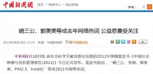晒三公、郭美美等成去年网络热词 公益慈善受关注2012-08-20中新网8月18日电 由社会科学文献出版社出版的2012年舆情蓝皮书《中国社会舆情与危机管理报告(2012)》今日正式发布。蓝皮书指出,“晒三公、官微、郭美美、PM2.5、hold住”等成2011年网络热词。 -