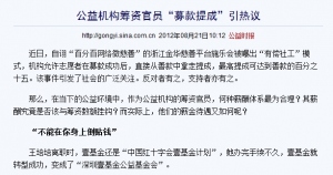 公益机构筹资官员“募款提成”引热议2012-08-21近日,自诩“百分百网络微慈善”的浙江金华慈善平台施乐会被曝出“有偿社工”模式,机构允许志愿者在募款成功后,直接从善款中拿走提成,最高提成可达到善款的百分之十五。该事件引发了社会的广泛关注。反对者有之,支持者亦有之。 -