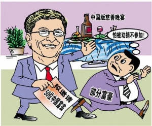 “隐形富豪” 将赴慈善晚宴(潇湘晨报)2010-09-28北京时间明日下午5时至7时半,将会是中国慈善史上一段难忘的时光。美国首富比尔·盖茨和“股神”沃伦·巴菲特将在北京举办一次私人晚宴,与中国富豪交流慈善相关话题。而早自8月24日开始,中国约50名富豪陆续收到了盖茨和巴菲特的亲笔慈善晚宴邀请函,但目前公开表态与会的富豪还为之寥寥。 -