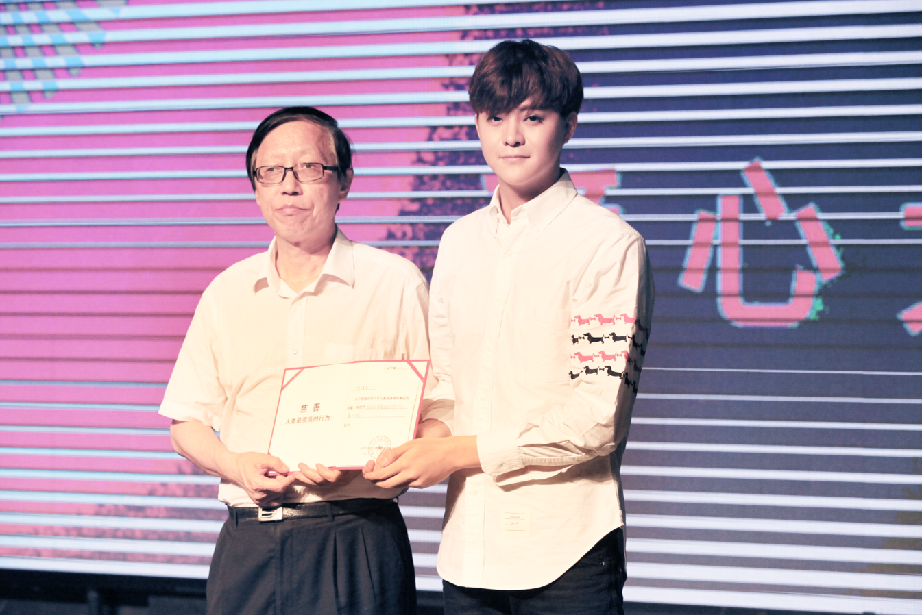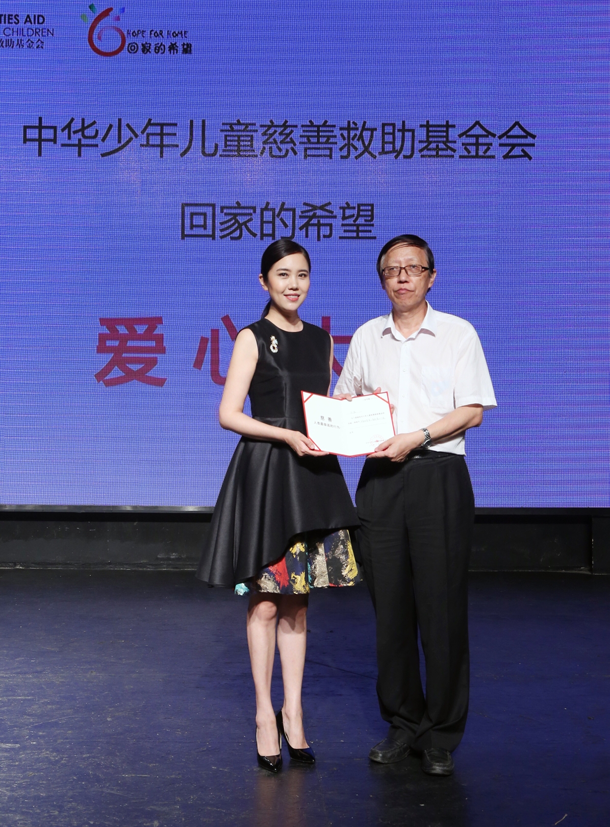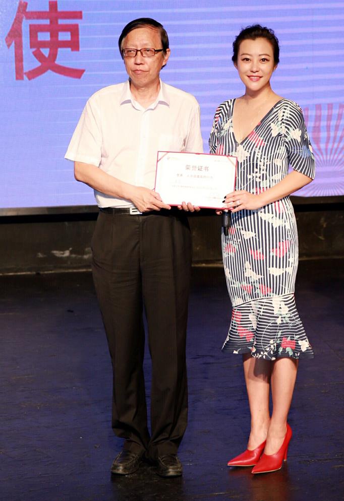 儿慈会王林理事长(左一)为演员何佳宣颁发荣誉证书
