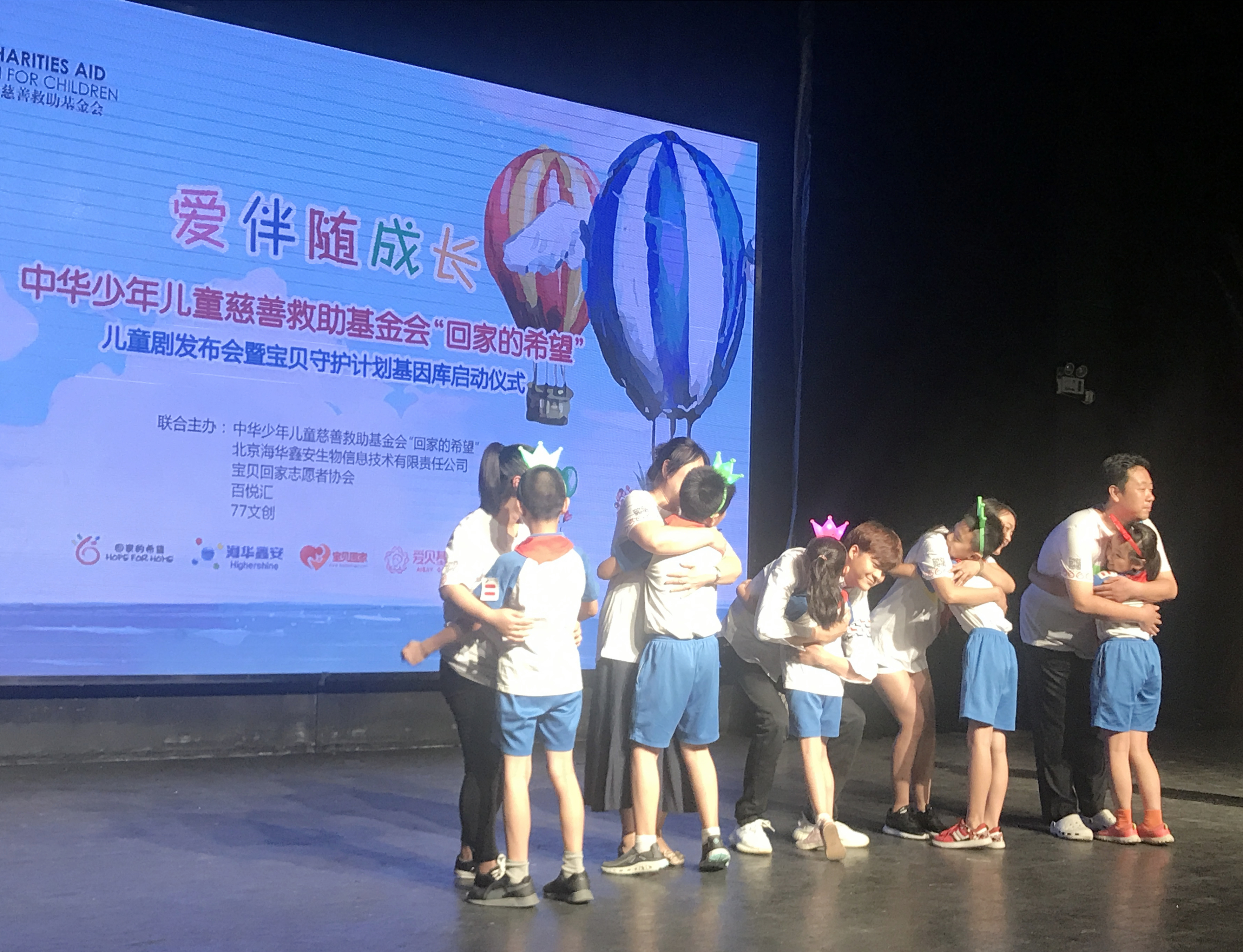 公益中国网讯 2017年7月3日,由中华少年儿童慈善救助基金会(以下简称“中华儿慈会”)“回家的希望”项目主办的《回家的希望》儿童剧发布会暨“宝贝守护计划基因库”启动仪式在北京77文创园剧场隆重举行。中华儿慈会理事长兼秘书长王林、北京?;伟采镄畔⒓际跤邢拊鹑喂咀芫碚艈?、副总经理钱琴、百悦汇创始人谷晶、著名演员郝蕾、演员何佳宣以及来自社会各界的爱心人士、媒体记者等近200人出席了本次发布会,共同见证《回家的希望》2017版儿童剧开票及“宝贝守护计划基因库”的启动。