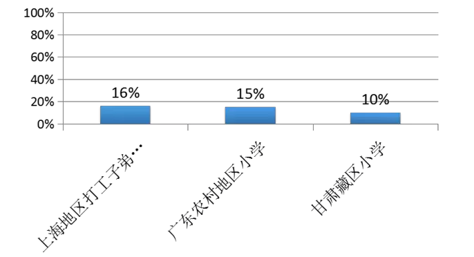 在近视的学生当中: 只有16%的学生戴了眼镜!这么低的戴镜比例是西部农村特有的现象吗? 不是!以往在不同地区的研究中也发现了类似的低戴镜比例。平均只有10%-16%的近视学生自己有眼镜。