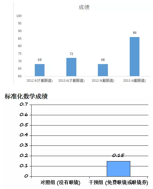 我们通过配戴眼镜这一有效矫正近视的方法来看近视是否对学生成绩造成影响。那么戴眼镜的效果究竟如何呢?