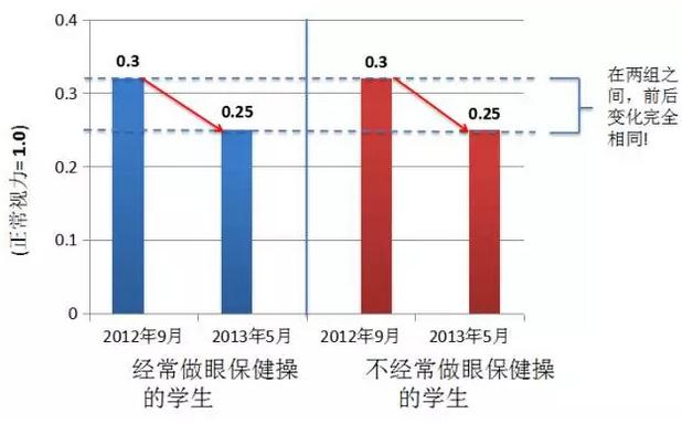 为了回答这一问题,REAP团队进行了为期9个月的随机干预实验。9个月后,在做眼保健操和不做眼保健操的学生之间作的近视情况的比较,我们发现没有任何区别!(相当于每9个月在视力表上退化一行)