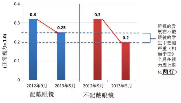 无论是否佩戴眼镜,学生视力都会在退化。但是非常显著的是,配戴眼镜学生的视力退化的速度更慢。