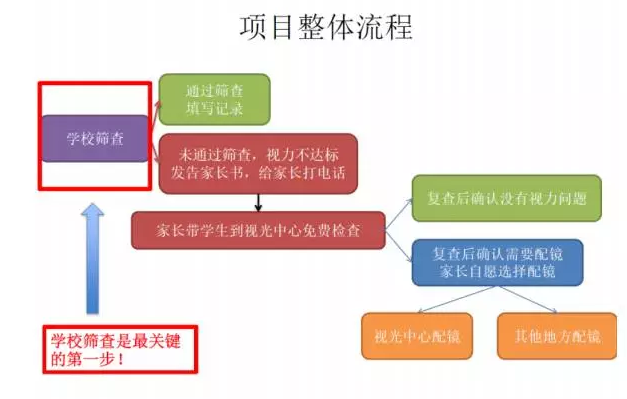 第二步:“视光中心”分批次对全县各学校的教师进行视力筛查培训,约每40位学生配备一位视力筛查教师。视力筛查教师回校后对所有的学生进行视力筛查,通知视力未达标的学生到县医院“视光中心”进行进一步验光和视力检查。