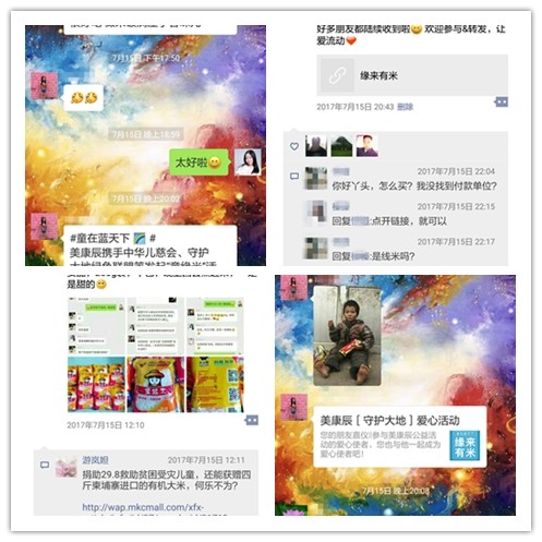 通过阶段性的活动反馈,让我们清醒和深刻认识到了互联网传播的巨大潜能,更收获了满满的感动和正能量。活动伊始,爱心企业-广州市美康辰健康产业有限公司通过自身、友商微信公众号、微信社群以及微信朋友圈助力“童缘米”。
