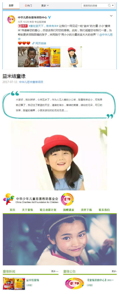 由中华少年儿童慈善救助基金会(以下简称:中华儿慈会)童缘资助中心联合爱心企业-广州市美康辰健康产业有限公司发起的“童在蓝天下,缘来有米”义卖活动自7月7日正式拉开帷幕至今,在“互联网+公益”的大背景之下,凭借众多的线上自媒体推广渠道以及“童缘联劝计划”合作伙伴的大力支持,截至目前在上线短短的十余天时间内,收获了包括北京、上海、广东、海南等在内遍及全国公众的爱心和支持,我们真切的见证了“小小一粒米”蕴含的巨大力量,亦让我们更加坚信“用小小的力量改变大大的世界”的理念!