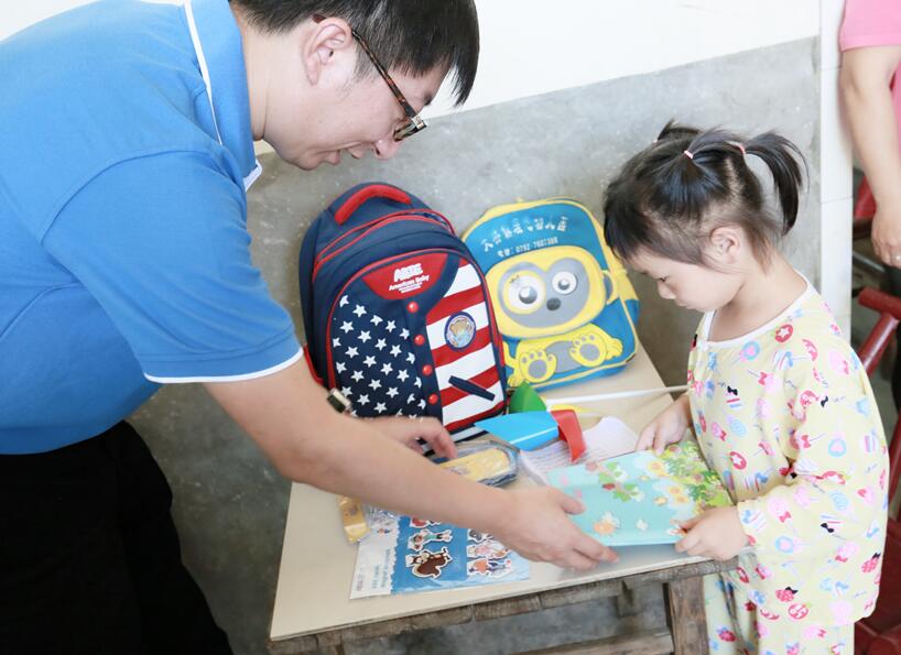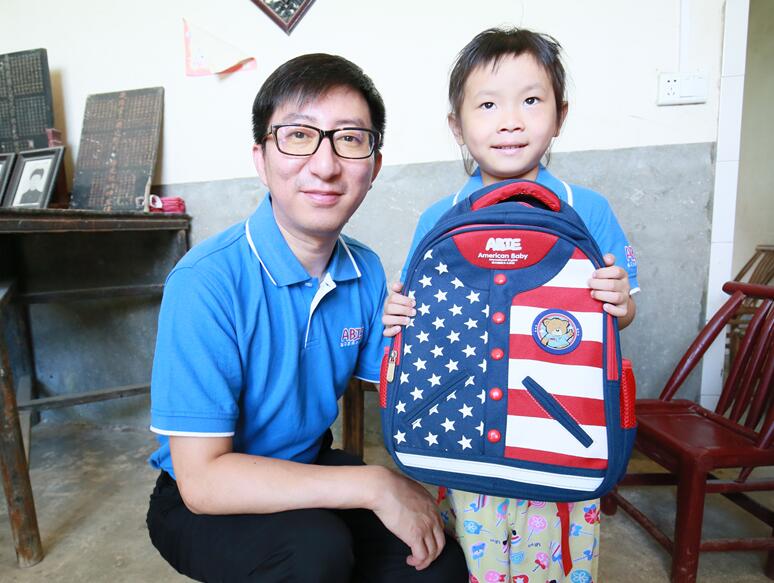 爱贝企业发展(上海)有限公司市场总监鲍文博到孩子家中做家访,为孩子送学习用品