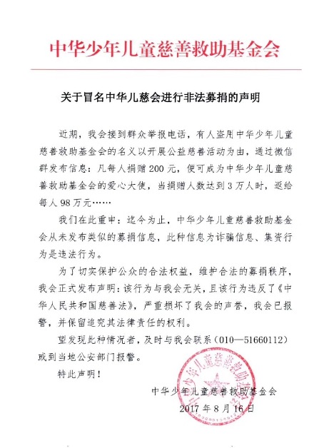 近期,我会接到群众举报电话,有人盗用中华少年儿童慈善救助基金会的名义以开展公益慈善活动为由,通过微信群发布信息:凡每人捐赠200元,便可成为中华少年儿童慈善救助基金会的爱心大使,当捐赠人数达到3万人时,返给每人98万元。