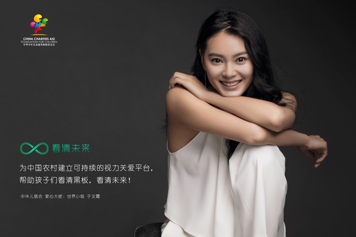 2017年9月5日中华慈善日这天,世界小姐于文霞女士被授予中华少年儿童慈善救助中心(以下简称中华儿慈会)瞳爱救助中心-看清未来救助基金“爱心大使”荣誉,感谢于文霞女士对农村学生的视力关爱,呼吁公众关注农村儿童视力健康、重视用眼卫生。