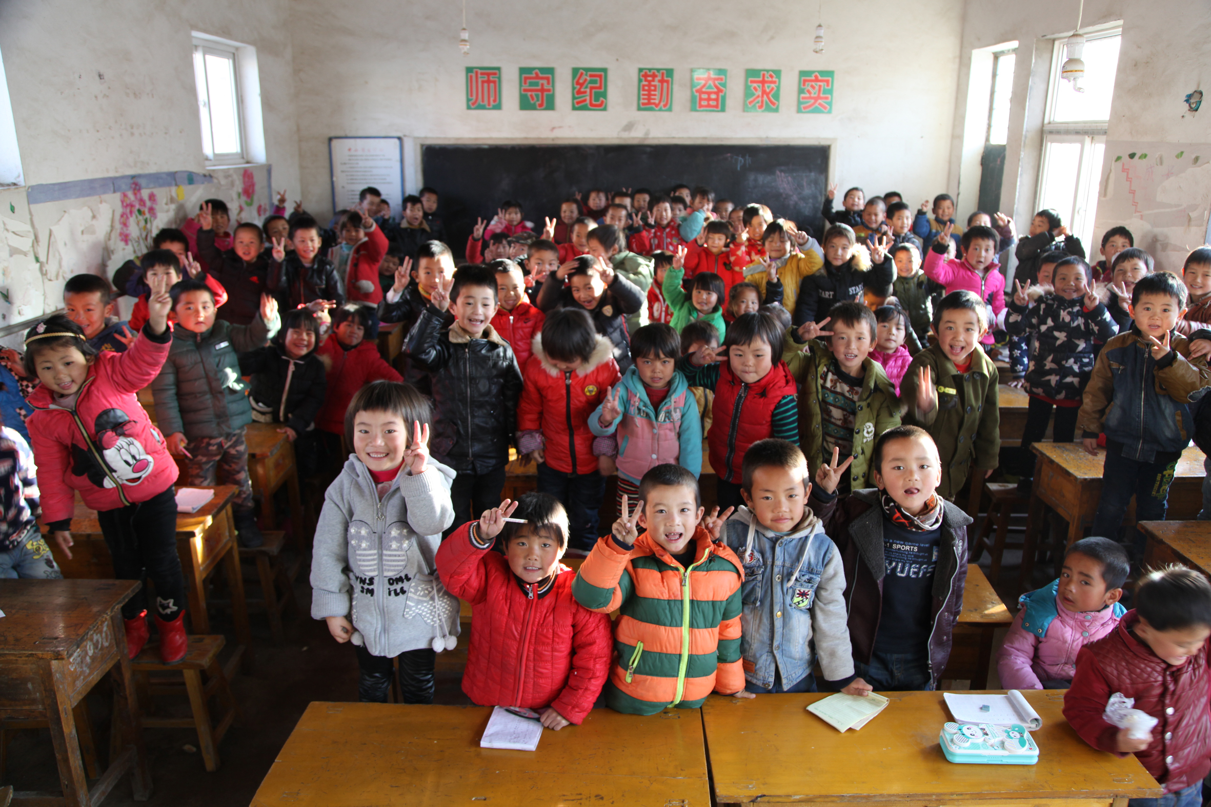 一个教室80多个孩子,一个课桌3、4个人分享,几十平米的教室里只有2、3个小小节能灯泡,这样拥挤的教室,混暗的灯光就是他们学习的地方……也许这已经是个条件很好的教室了!