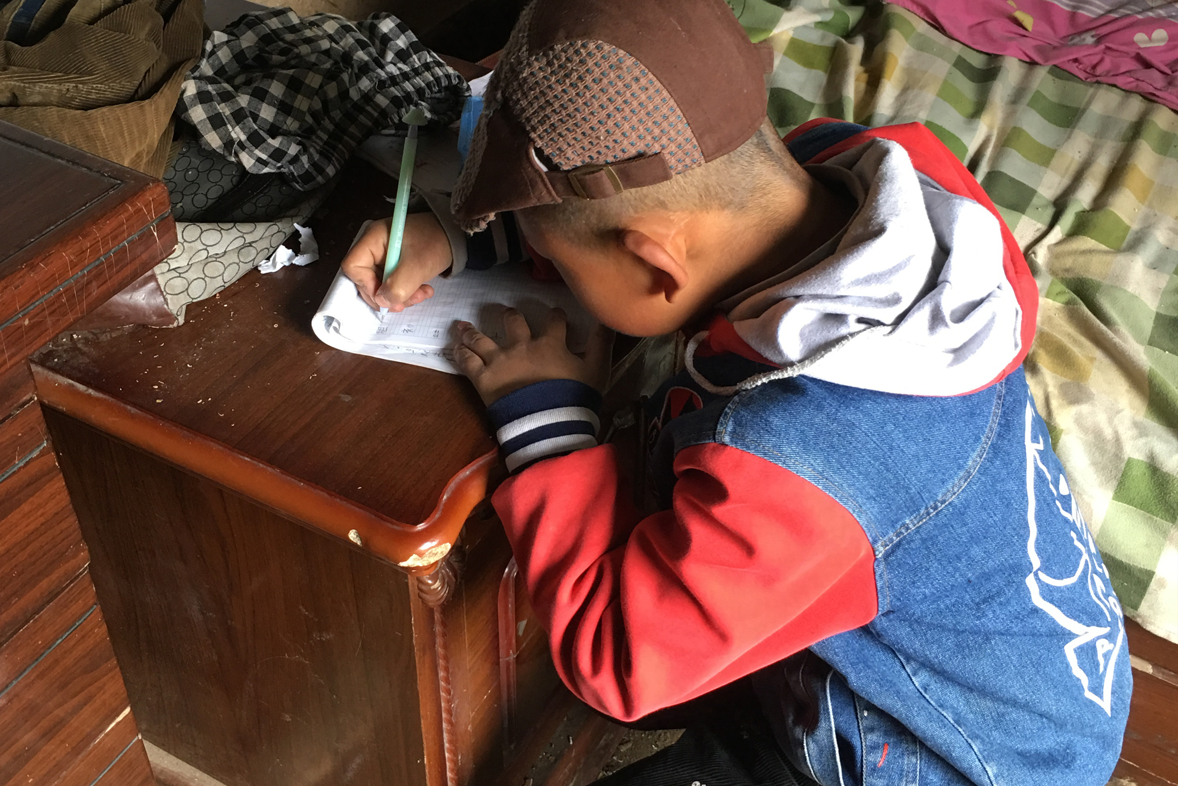 几平方米的小屋,一张破旧的大床占了多半个房间,房门门帘上方一条细细的管灯发出昏暗的光,一个小柜子就是他的书桌,这就是回家做作业的地方……起码他还有个自己学习的小小地盘儿!