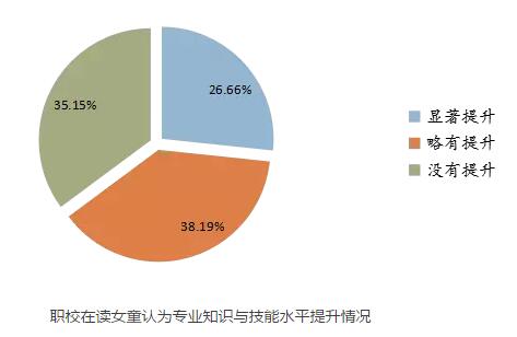 六成女童专业技能水平提升,近八成女童认为所学知识有助于就业。调查显示,在受调查职校学生中,26.66%的女童认为入学后专业知识与技能水平显著提升,38.19%的女童认为略有提升,即超过六成的女童接受职业教育后,专业知识与技能水平有所提高,明显高于男童。