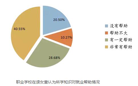 调查显示,79.50%的职业学校在读女童认为职业教育所学知识与技能对未来就业有帮助,明显高于其他类型儿童。其中,40.55%的职业学校在读女童认为非常有帮助,28.68%的女童认为有一定帮助,10.27%的女童认为有帮助但帮助不大。仅有20.50%的女童认为职业学校所学知识与技能对未来就业没有帮助。