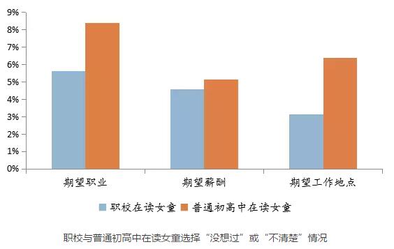 职业教育在校女童未来职业规划更清晰。在未来期望职业、未来期待工作或生活地点、未来期望薪酬等方面,职校在读女童选择“没想过”或“不清楚”的比例远远低于普通初中和高中在校女童。可见,经过职业教育培养、掌握专业技能的女童,对于未来职业发展目标更明确,对未来就业规划更清晰。